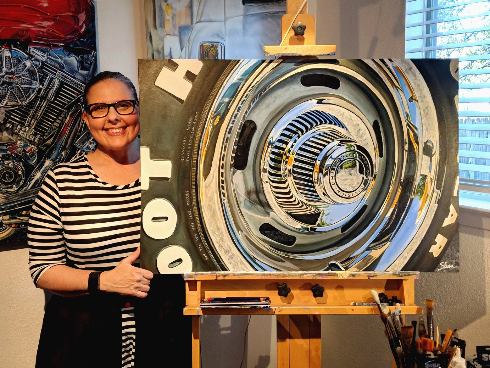 I’m so fortunate to meet the people I do through vehicles and art. One of my treasured contacts is a GT3 racing driver and his staff. I’ve had the pleasure of painting several of their vehicles, and they know I’m always looking for interesting vehicles to paint. This lovely lady was in their inventory, and they gave me a call to come photograph her before she was shipped to the new owner. Although the car is stunning, I was instantly captured by the chrome wheels and abstract reflections. My yellow bowling shirt and Converse high tops added a bit of pop to the asphalt and landscape. This was a fun piece to paint.