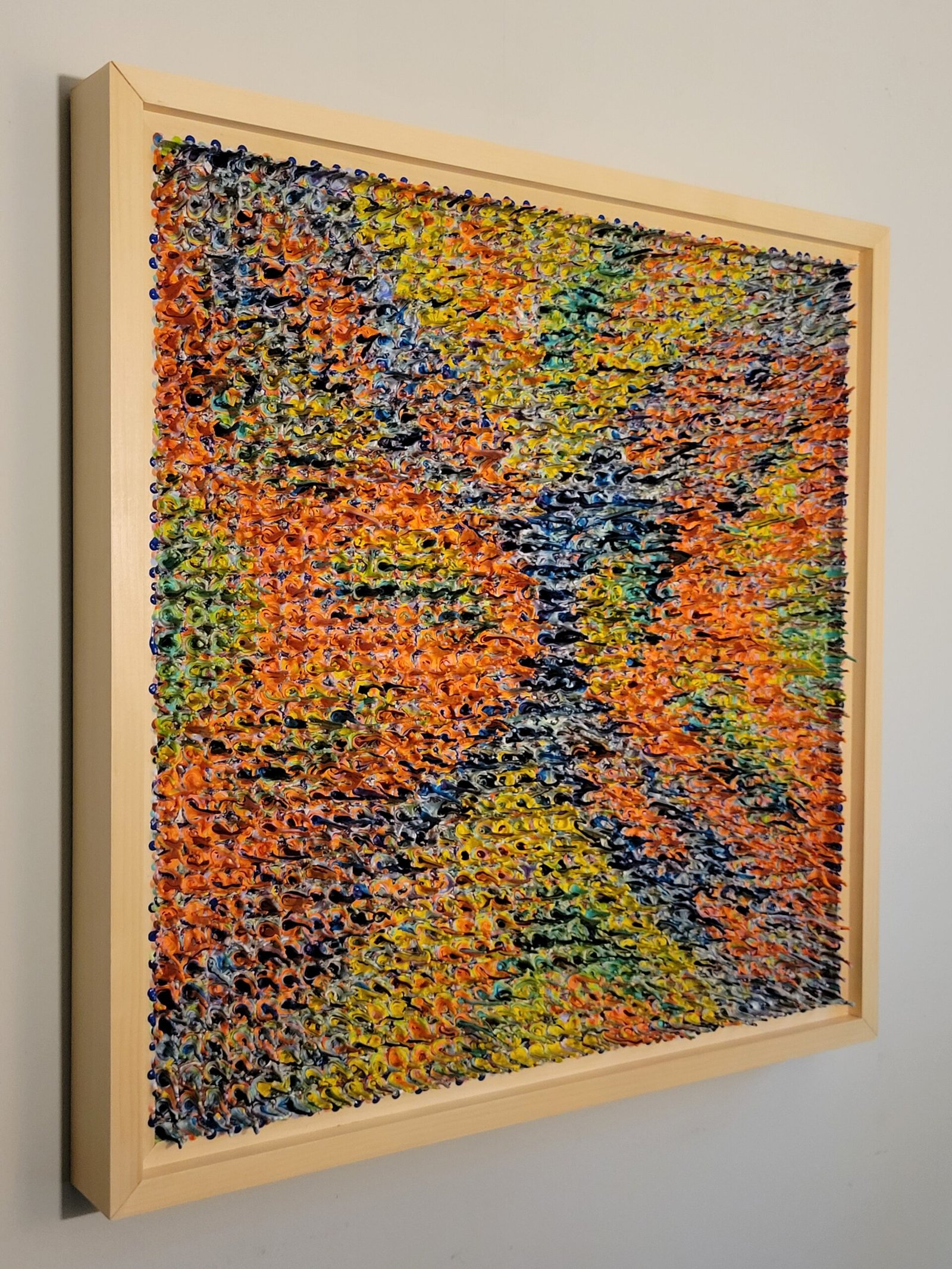 This painting is part of a series of paintings that I have recently been working on. The surface has a high relief of "frozen drips" that protrude from the surface like a blizzard of stalactites. The result is a colorful highly textured, pixelated, pointillistic surface as I call it. It's about "seeing paint" and what it reveals in It's surface and imagery. I have extended the picture plane into the viewers realm and brought them in turn into the painting.