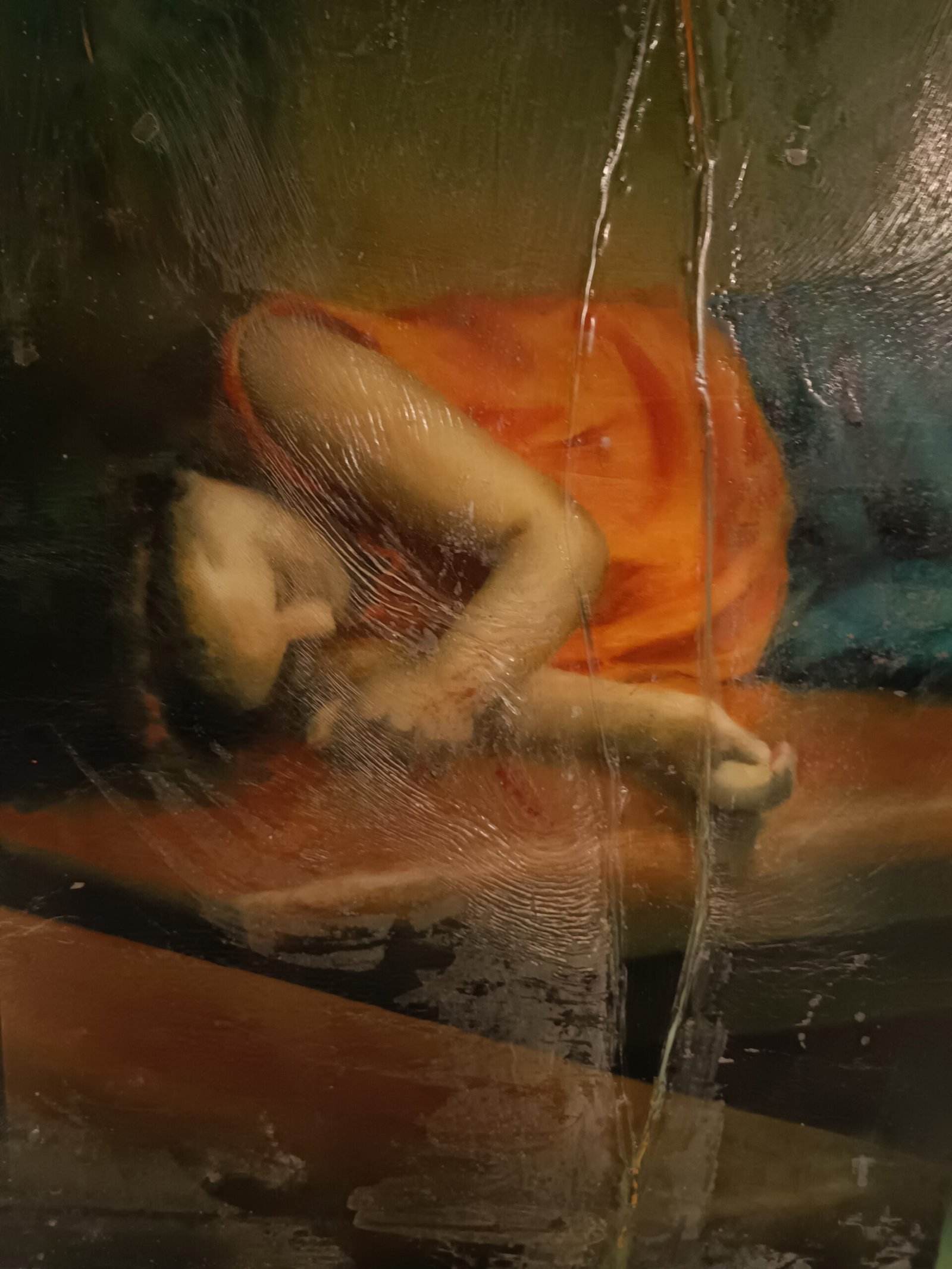 Cuantas veces habremos pensado que el significado de una obra están en los ojos del que lo contempla pues cada espectador ha tenido unas vivencias, recuerdos, tiene unos conocimientos y esto hace por tanto que cada uno aprecie cosas distintas al ver una obra. Esta obra me la planteé teniendo en cuenta esto. Esta escena se desarrolla en un cuarto pequeño, que se cierra sobre la niña y que además se cierra con una cortina. Me gustaría que se planteara la gente es la historia que puede haber detrás de esta escena, una niña sola en una sala que parece cerrarse sobre ella , está niña se ha quedado dormida , ¿por qué está sola? ¿Por qué está cansada? ¿Dónde ocurre?...Nosotros como espectador la vemos desde el otro lado de una cortina de plástico, que deja entrever a esta niña, observándola. Esta cortina fue lo que me llevó a crear esta escena y era lo que no quería que faltara, aunque fue lo último en hacerse , pero es lo que construye la escena
