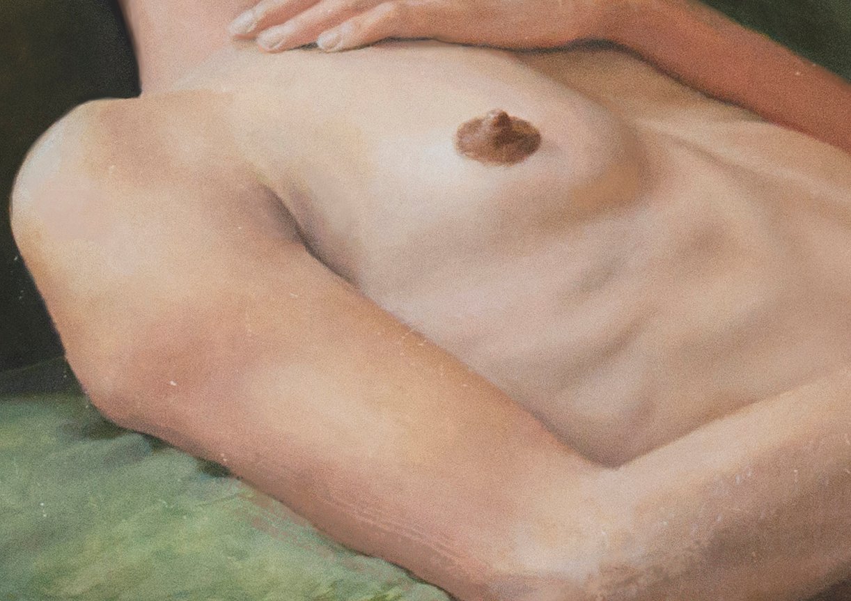 Realizado durante mi estadia en Premia de Mar, cautivado por la luz que ponia en relacion la carne y el color del sofa, con el fondo de azulejos. Mi interes principal en esta obra fueron la composicion cromatica y formal. La decisiones tendian hacia lo sugerente, lo incompleto y lo armonico. Los ojos cerrados siempre me cautivaron, la instrospeccion o lo potencial se reflejan en la figura despierta con ojos cerrados.