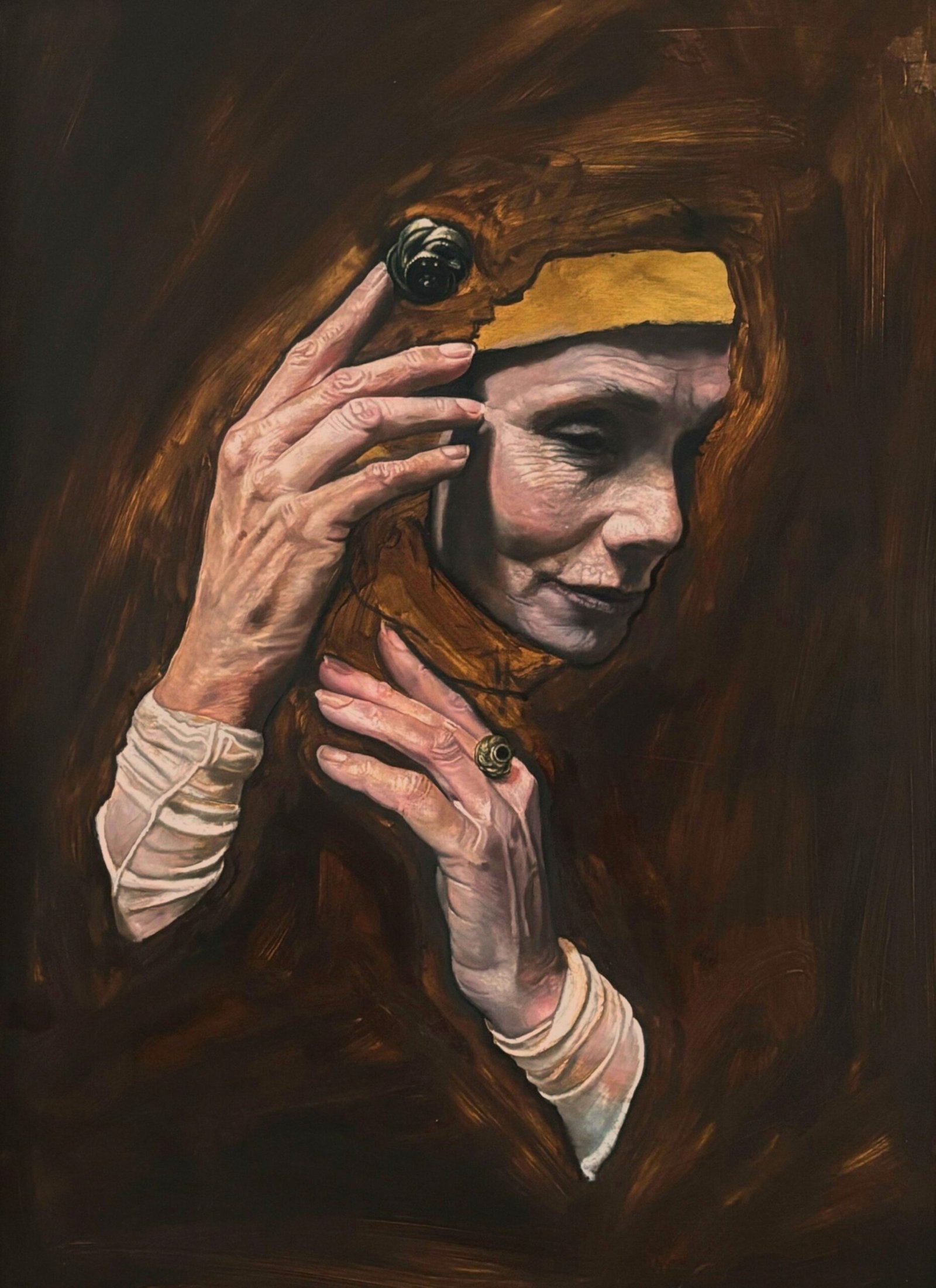 Seemingly lost in thought, the model looks out of the right half of the picture with her head tilted slightly downwards. Both hands are next to the head on the side facing the light and look as if they are trying to feel something. The upper hand is touching a brooch that appears to be floating freely. There is a hint of a smile on the face, which is criss-crossed with wrinkles. The portrait rises up from the painting ground like a relief, lending the image a spontaneous radicality, although the moment seems frozen in time. A few brushstrokes hint at a further possible development of the painting, but leave this open. The earth tones that characterize the oil painting create a touch of the old master's manner. At the same time, however, a contemporary zeitgeist is at work in it, which lies impalpably over the scene like an invisible veil.