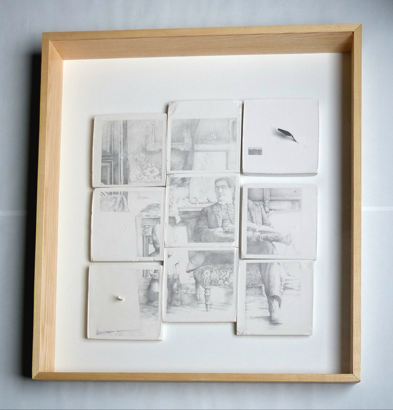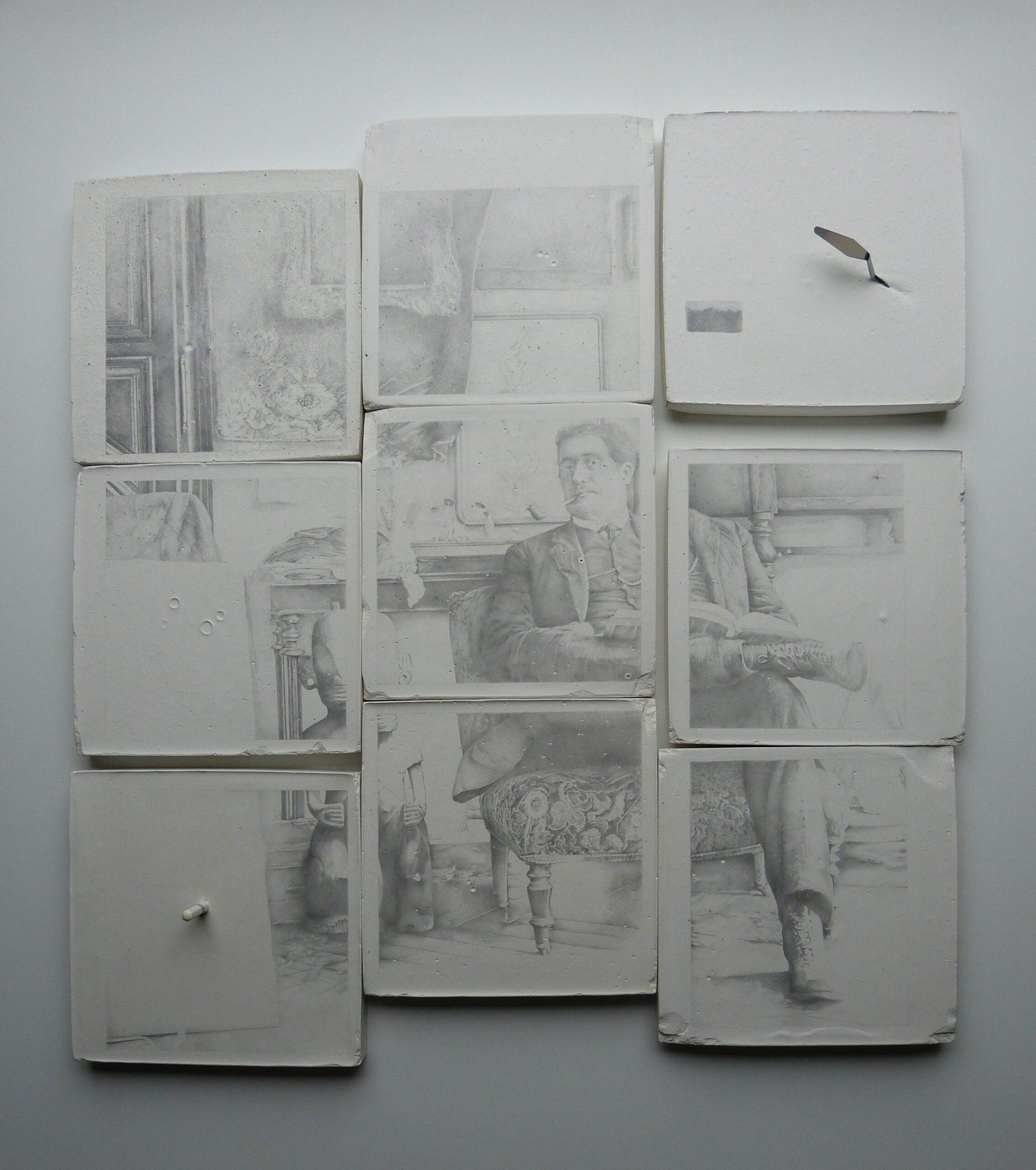 Retrato inspirado en la literatura, en el cual parto de la fragmentación como idea principal para crear una composición gráfica a través de una analogía imagen-literaria de su concepto, donde el dibujo fragmentado representa a su vez las partes de un libro. Con esta obra pretendo romper el aspecto tradicional de formato, utilizando como soporte placas de yeso para simbolizar lápidas, generando así un contenido profundo, y a las que adhiero algunos pequeños objetos que insinúan a los utensilios del taller de pintura y además aluden a los recuerdos : El lápiz que guardé durante años que jamás utilicé y la espátula con la que realicé mi primera pintura… « el libro » que siempre me acompaña. En el desarrollo de mi propuesta me he enfocado hacia el retrato a partir del dibujo en una exploración de soportes no convencionales, superficies delicadas que requieren de una cuidadosa técnica, apropiándome del lápiz como única herramienta.