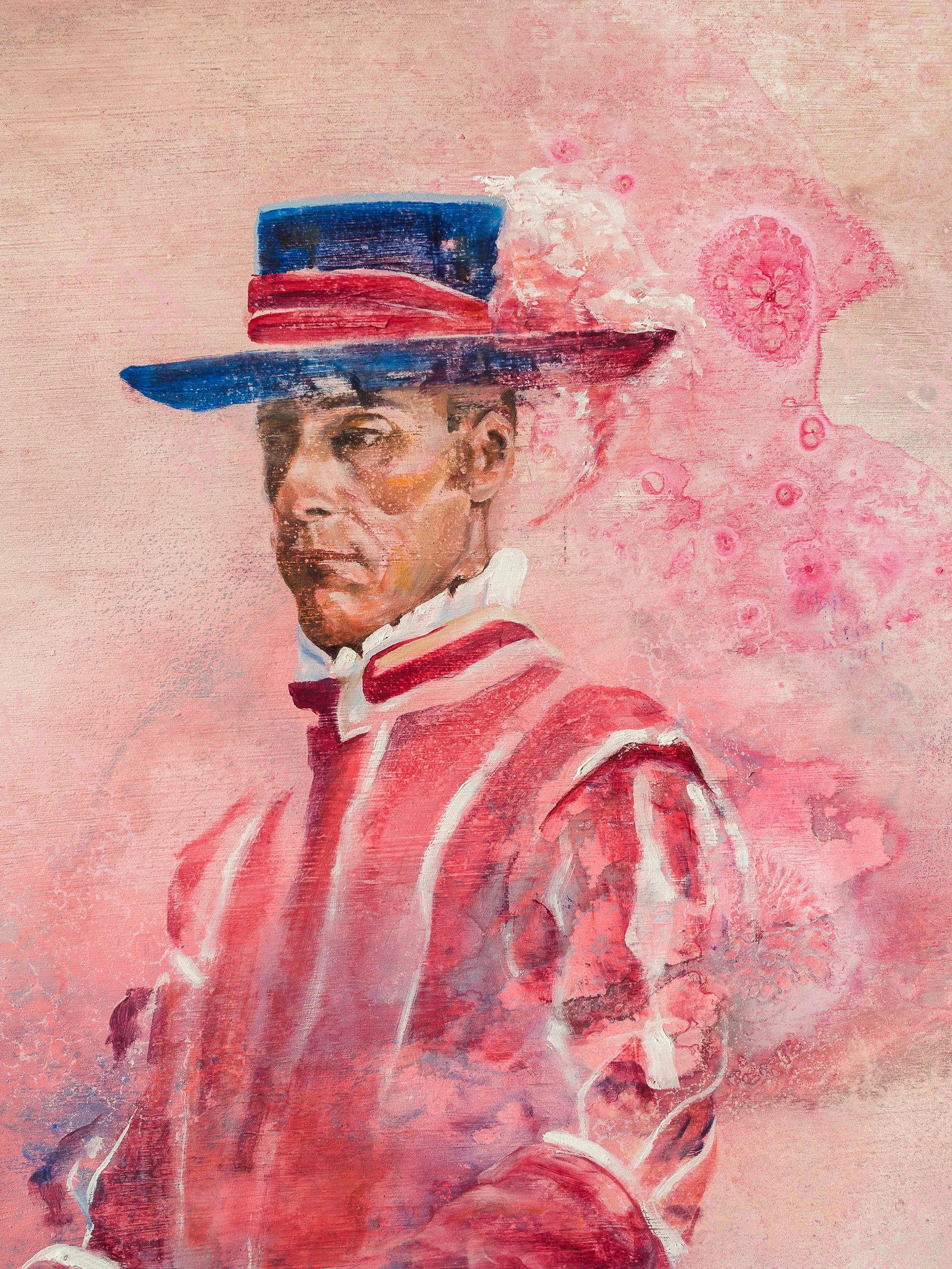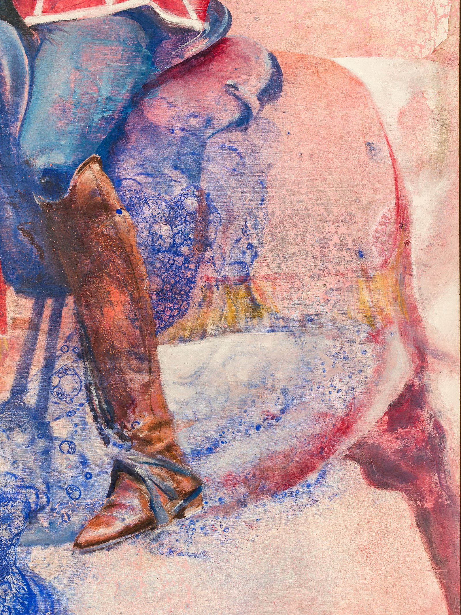 "Arión" 89x116 cm. Acrylic and oil on cradled panel. In this piece, abstraction shares the spotlight with figuration. The Spanish purebred horse and its rider, inspired by the elegance of Philip II's era, stand out thanks to the use of transparencies. The background's textures and colors blend seamlessly, creating a composition where everything flows as one. The name Arión comes from Greek mythology: a divine horse, son of Poseidon.