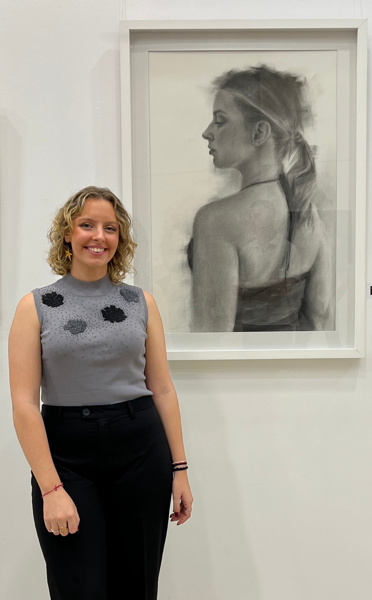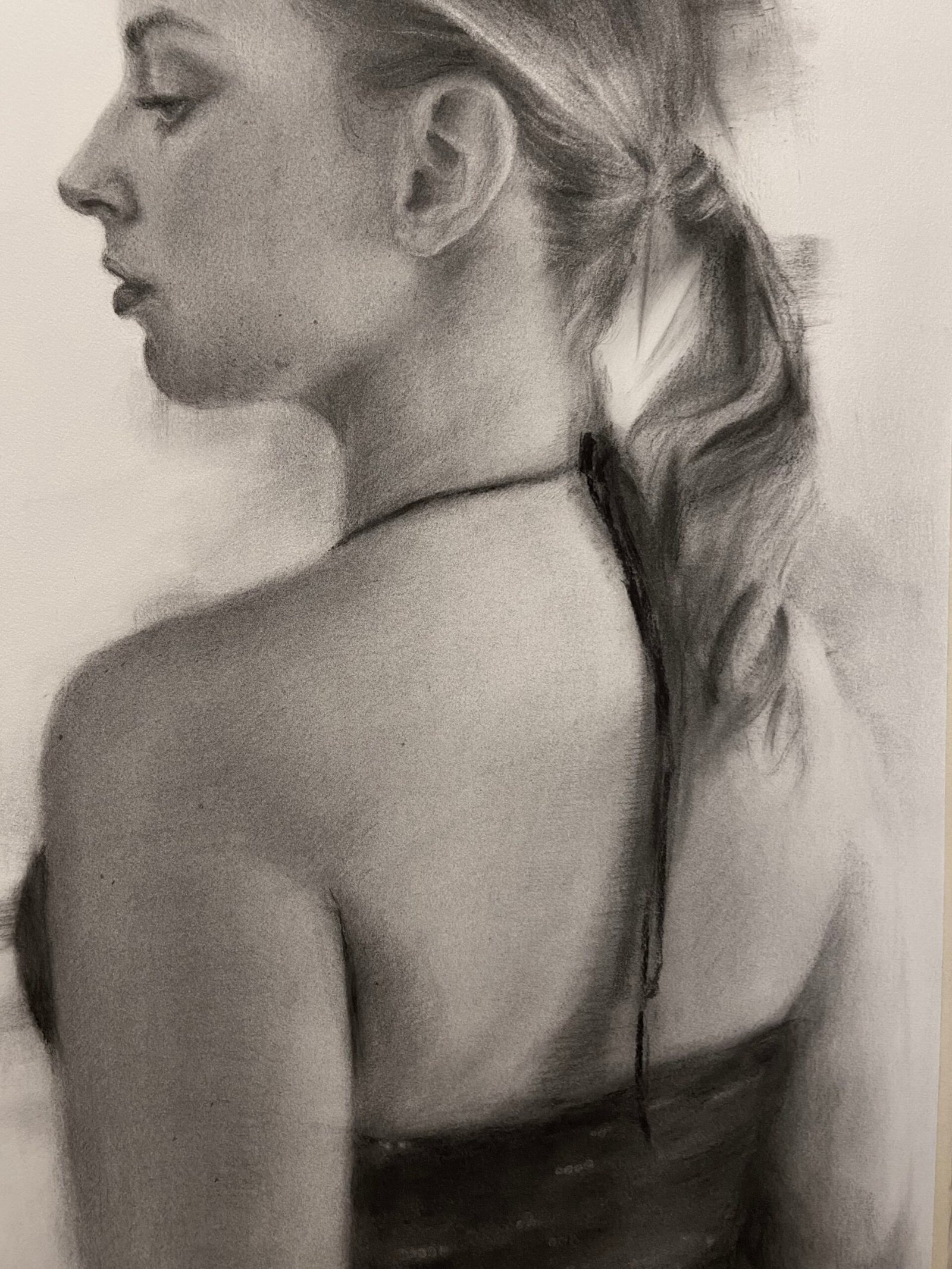 Esta obra, realizada en carboncillo y grafito, explora la luz y la forma a través del retrato femenino. La elección de materiales permite contrastar precisión y expresividad, logrando una atmósfera íntima. La figura de perfil y los bordes difuminados sugieren introspección y movimiento, mientras que el juego de luces y sombras refuerza la profundidad. En conjunto, la obra captura un instante efímero, donde la figura emerge con sutileza, como un recuerdo atrapado en el tiempo.