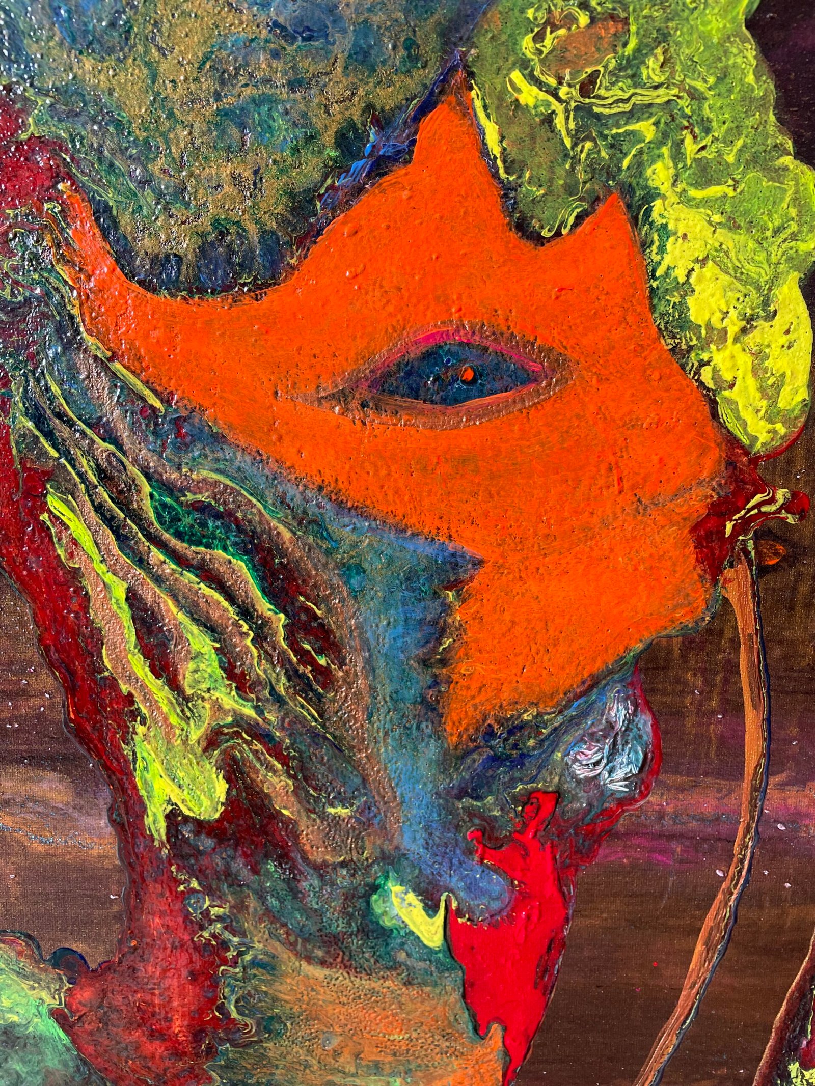 Battle of the Giants is in pouring technique with fluid gold on canvas. My work is about the struggle between power, feeling, tradition, revolution, social conditions and hope for a beautiful life. The horizon is dark, a Monk in a red dress tries to eliminate the giant, on the left in the picture the first alien of the future, the face of a human being but the body of a machine, all connected with a long cord which is shaped by the history of humanity. The background of the work is gold, the golden times of people are now in the frame, nature is trying to assert itself: the tulip grows on the head of an unnatural snake. Traces of blue water: lifeblood of people can be seen somewhere in the lower part of the picture. All shapes now form the silhouette of an individual who looks like a count /Graf.