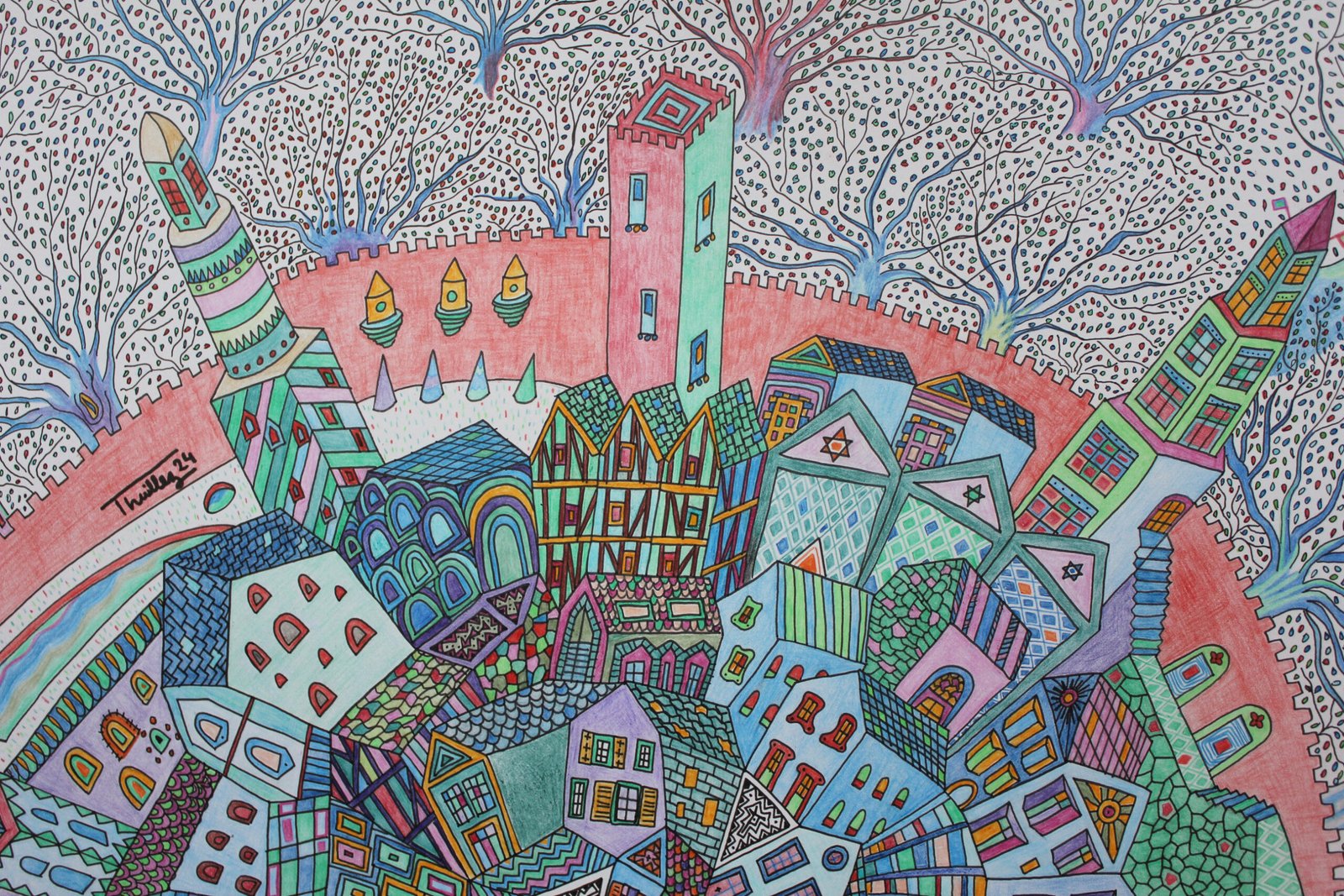 This drawing constructs a universe where architecture interacts with the organic forces of life. Imbued with the imagery of tales and the history of Western and Eastern architecture, this piece of work resembles intricately woven spider webs, inviting the viewer's eye to lose itself within them : it presents a dreamlike vision of the city This composition, rich in both detail, and vibrant colors, offers an immersive visual experience where the city and nature blend harmoniously. Inspired by Art Brut, Naïve Art movements, and the work of Hundertwasser.