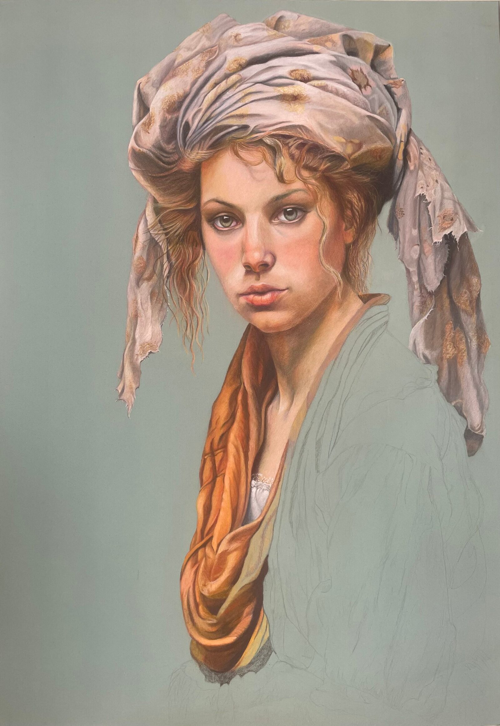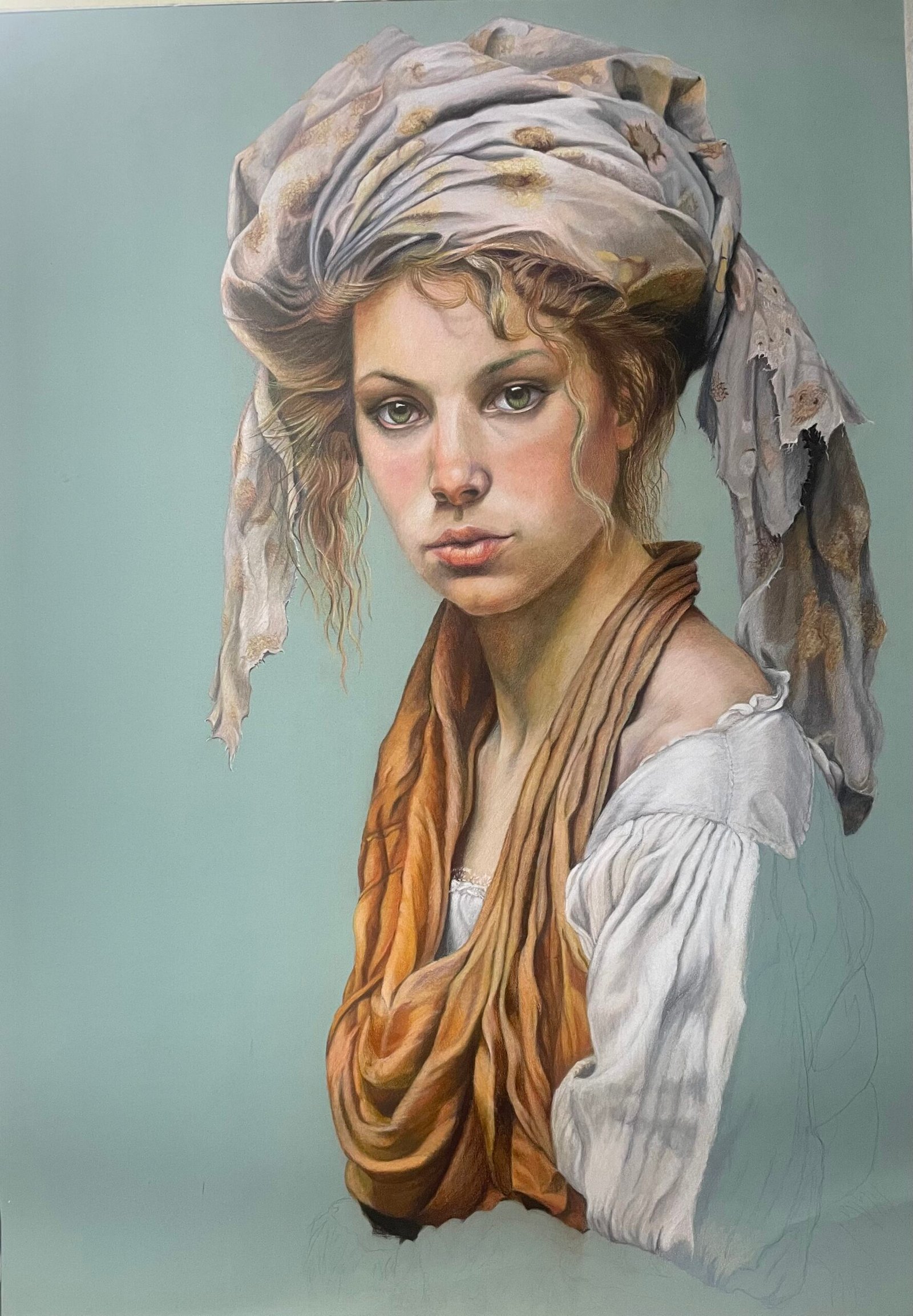 Con la técnica del Verdaccio y lápices de colores Faber Castell, he querido reflejar la imagen de la belleza de una mujer del renacimiento de clase social trabajadora. No hay riquezas en sus ropas, no hay fondo, solo ella.