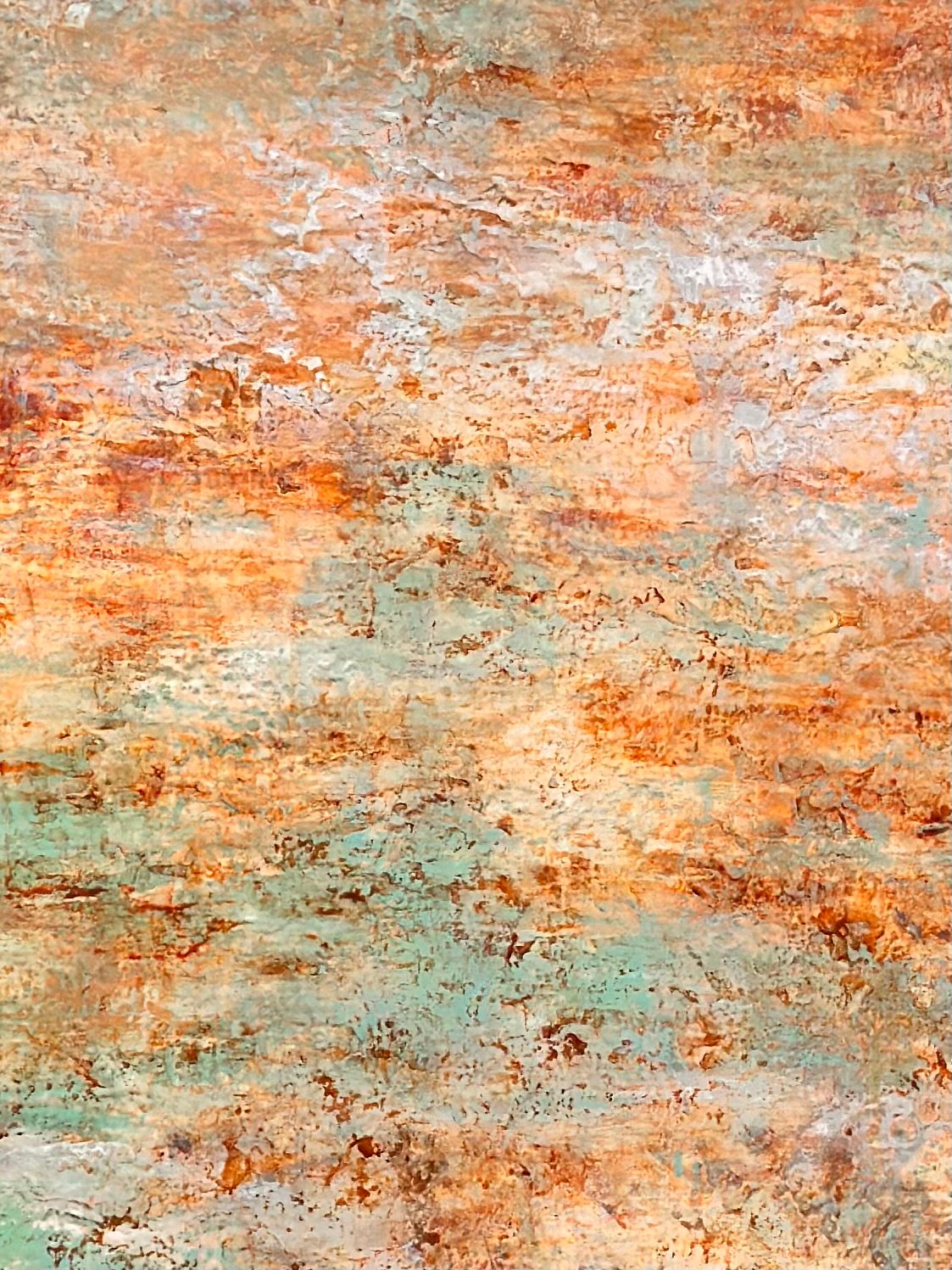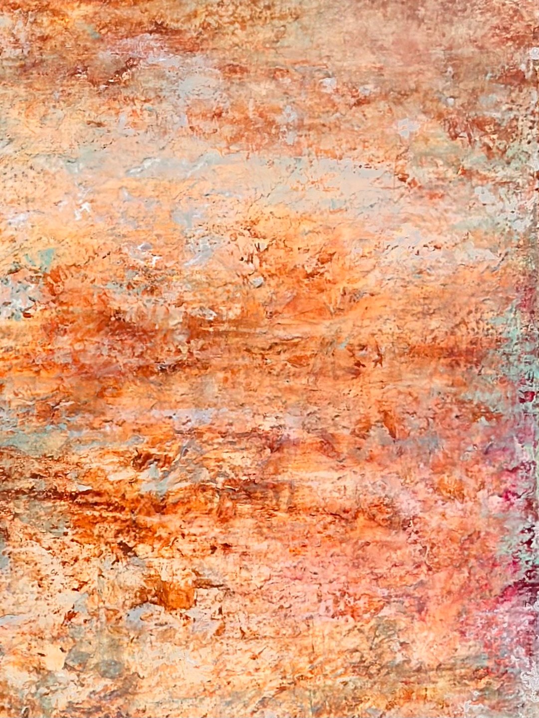 "Bruma Cálida" es una exploración de la atmósfera y la memoria a través de la textura y el color. Trabajé en capas superpuestas para crear una sensación de profundidad, como si la bruma envolviera el espacio y difuminara el tiempo. Las texturas emergen y se ocultan, evocando la manera en que los recuerdos aparecen en nuestra mente: algunos claros y vibrantes, otros sutiles y etéreos. Los tonos cálidos y terrosos se mezclan con verdes suaves, sugiriendo la calidez del sol que atraviesa una niebla matinal. Este proceso de aplicar, retirar y reaplicar capas es mi forma de conectar lo tangible con lo intangible, invitando al espectador a perderse en el misterio de la obra y en su propia interpretación del momento capturado.