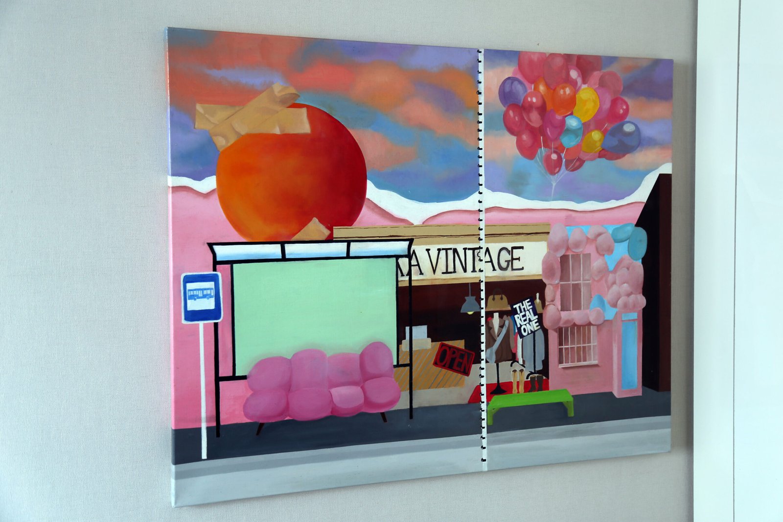 When I was young, there wasn't any vintage stores in the city where I was born in. I dreamed about pretty vintage stores by reading European novels. The excitement of people who are heading to one bus stop to the next bus stop in their lives is expressed on this painting. In other words, This painting is about the story of the places and experiences people encounter at the several bus stops in their lives.