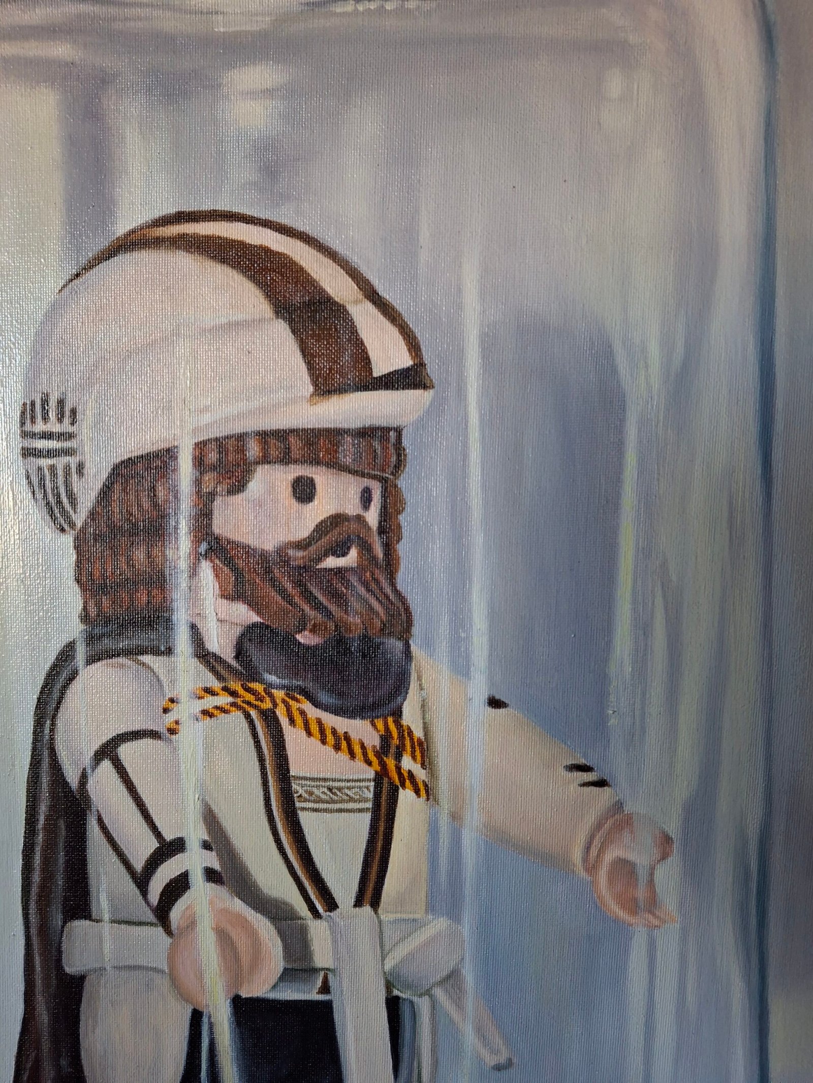 Óleo al agua sobre lienzo montado en bastidor de madera. Con esta obra quiero mostrar la, demasiado habitual, sensación que muchos artistas sentimos ante un "bloqueo" que no nos permite avanzar. Del mismo modo que muchas situaciones de nuestra vida personal nos absorben sin permitirnos avanzar en nuestra vida. La composición es simple, con un mensaje directo, buscando un lenguaje pictórico comprensible para todos los públicos.