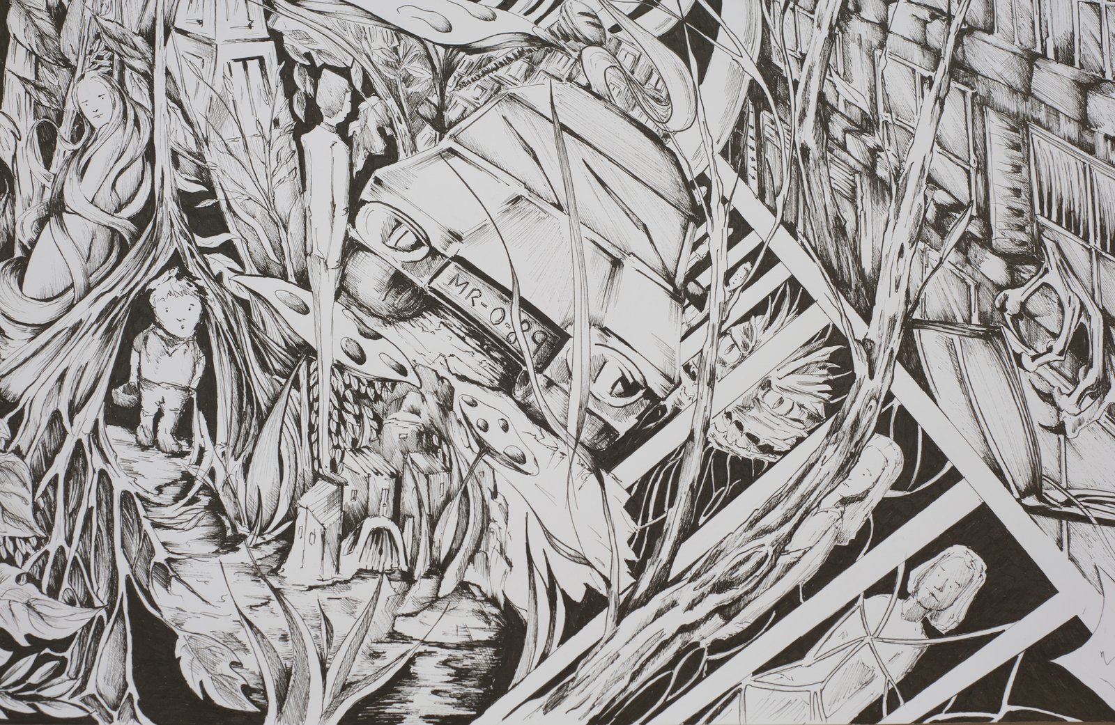 This work is divid into two parts, city environment and elements of nature. The creativity of the visual narrative leaves for various interpretacions. The work was created on A2 white cardboard, with a black draming pen 0.05 to 0.8 in the city seville 2024