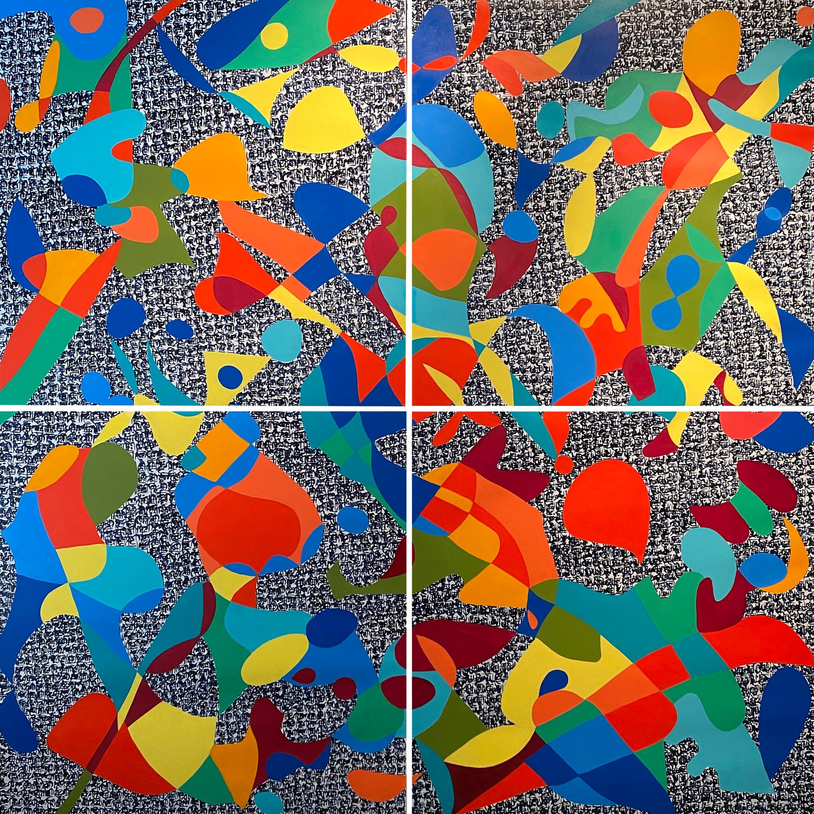 Creation Begins is inspired by the Cosmos . The writing in the background creates a kind of vibration with repetition of the words Al Khaliq (Creator), Al Bari (Evolver), Al Musawwir (Designer) in Arabic language referring to the Creator. The colors and shapes represent the seemingly unlimited shapes, forms and types of creation in our Universe which is constantly evolving, and expanding. It also alludes to multiple universes, countless galaxies, stars , other heavenly bodies and even complexities in the human brain that have been discovered and much more that is yet to be discovered. Everything in the Universe is connected atomically at some level but vibrates and at different frequencies. It seems that all parts of our Cosmos are designed to exist and interact with each other, affecting one another even if light years apart.