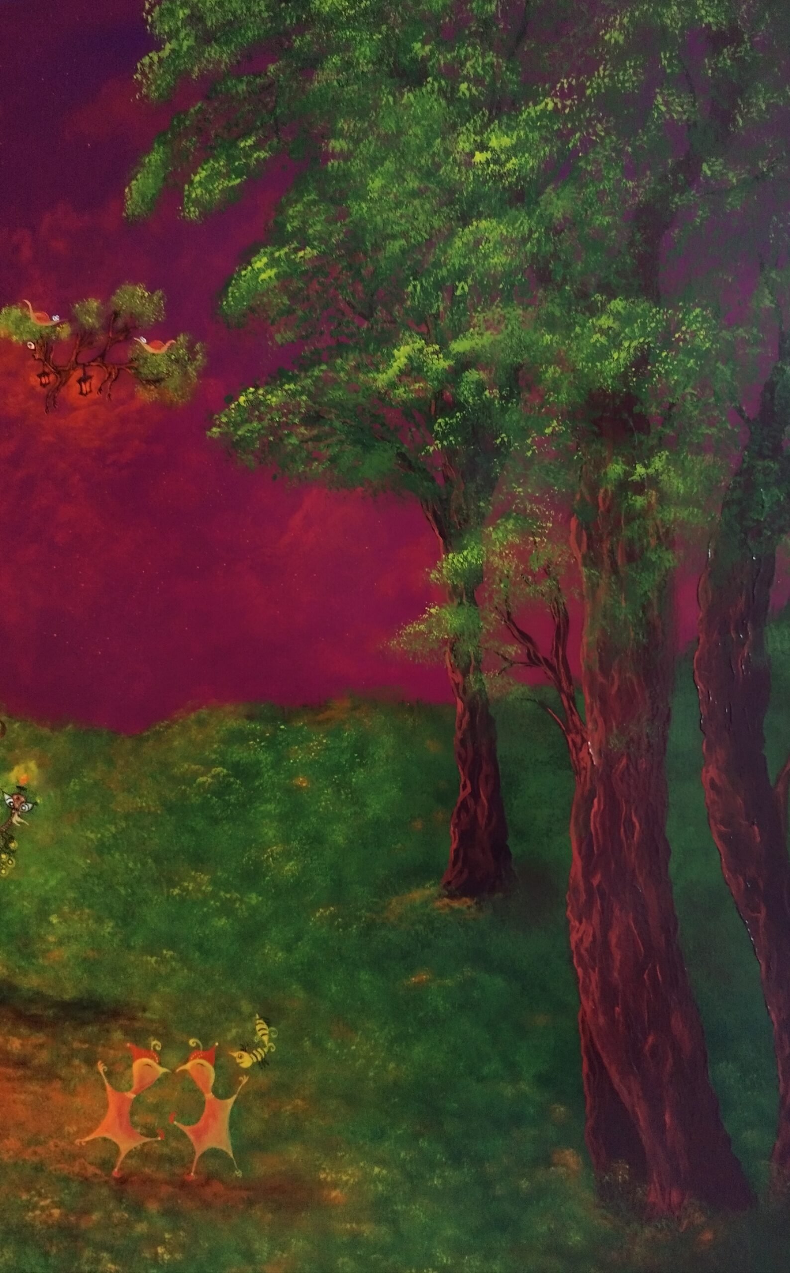 Dans un paysage de campagne baigné par la lumière crépusculaire, tout un petit monde fait la fête autour d'un feu de camp. Une fleur cheffe d'orchestre, en haut à gauche du tableau, semble mener la danse. Sous son action enchanteresse, même la végétation s'anime ! Deux arbres plein d'ivresse se trémoussent, suivis d'une armée de joyeux petits arbrisseaux. Au-dessus des deux arbres dansants, deux klaxons volants à tête d'étoile, portés par des hélices, chantent en chœur. Un petit animal tranquille se laisse bercer par les chants sur sa balancelle de velours, tandis que deux oisillons, à sa droite, se font la conversation. Un oiseau-lustre, un peu frustré d'être suspendu là, condamné à n'être que spectateur, aimerait pouvoir se mêler à la fête donnée un peu plus bas. Autour d'un bon feu, deux drôles de créatures mi-lutin mi-oiseau, ainsi qu'une petite abeille à lunettes, sont emportées dans une danse frénétique, sous le regard amusé d'un chat masqué. Se décidera-t-il à les rejoindre ?
