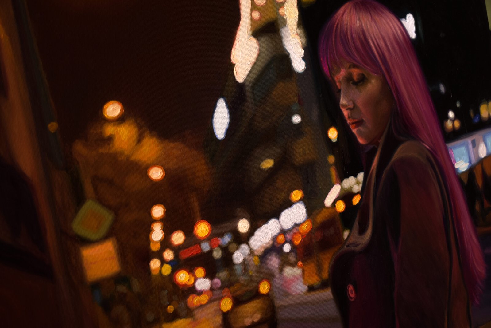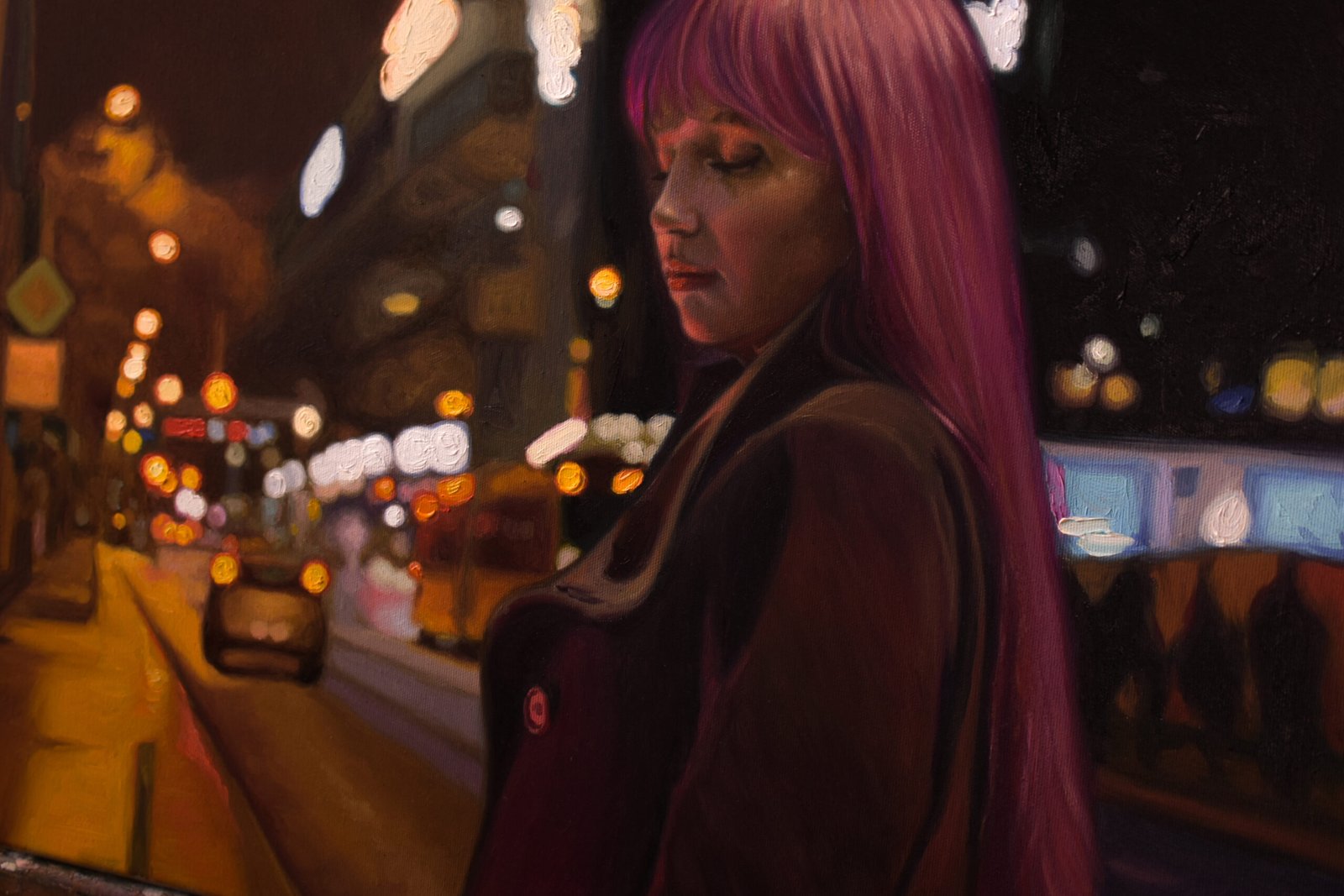 "December Spleen" is a realistic painting depicting a solitary woman against the backdrop of a blurred, nighttime city street. Her closed eyes and slightly bowed head suggest introspection and emotional withdrawal. The scattered streetlights form soft, almost abstract shapes, enhancing the sense of isolation. The dark tones of the background, infused with the chill of the winter air, amplify the feeling of nostalgia and quiet sorrow, creating an image filled with subtle emotions and reflection.