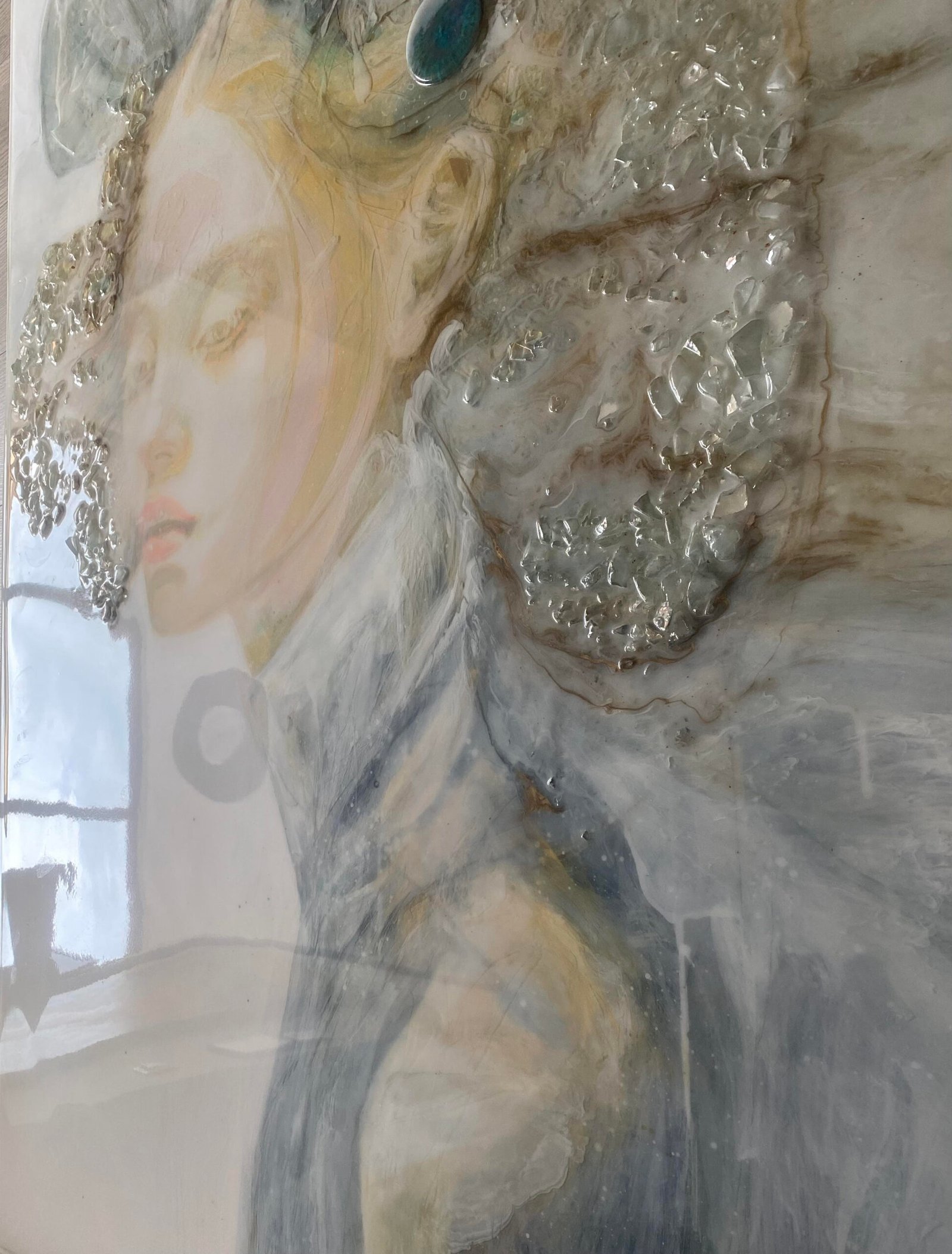 Este cuadro en su delicadeza y elegancia representa la dualidad femenina de fragilidad y fortaleza. De ahí la utilización de los cristales, cuya fragilidad contrasta con la dureza de su estructura. La verdadera belleza y elegancia no residen tanto en lo externo, sino en la paz interior y en la autenticidad de quien es capaz de mirar dentro de sí misma y encontrar su propia luz. Tec mixta con resina epoxi. pintura realizada en varias capas de resina que da profundidad a la superficie. acabado mate y brillante según zonas, en foto no se aprecia bien