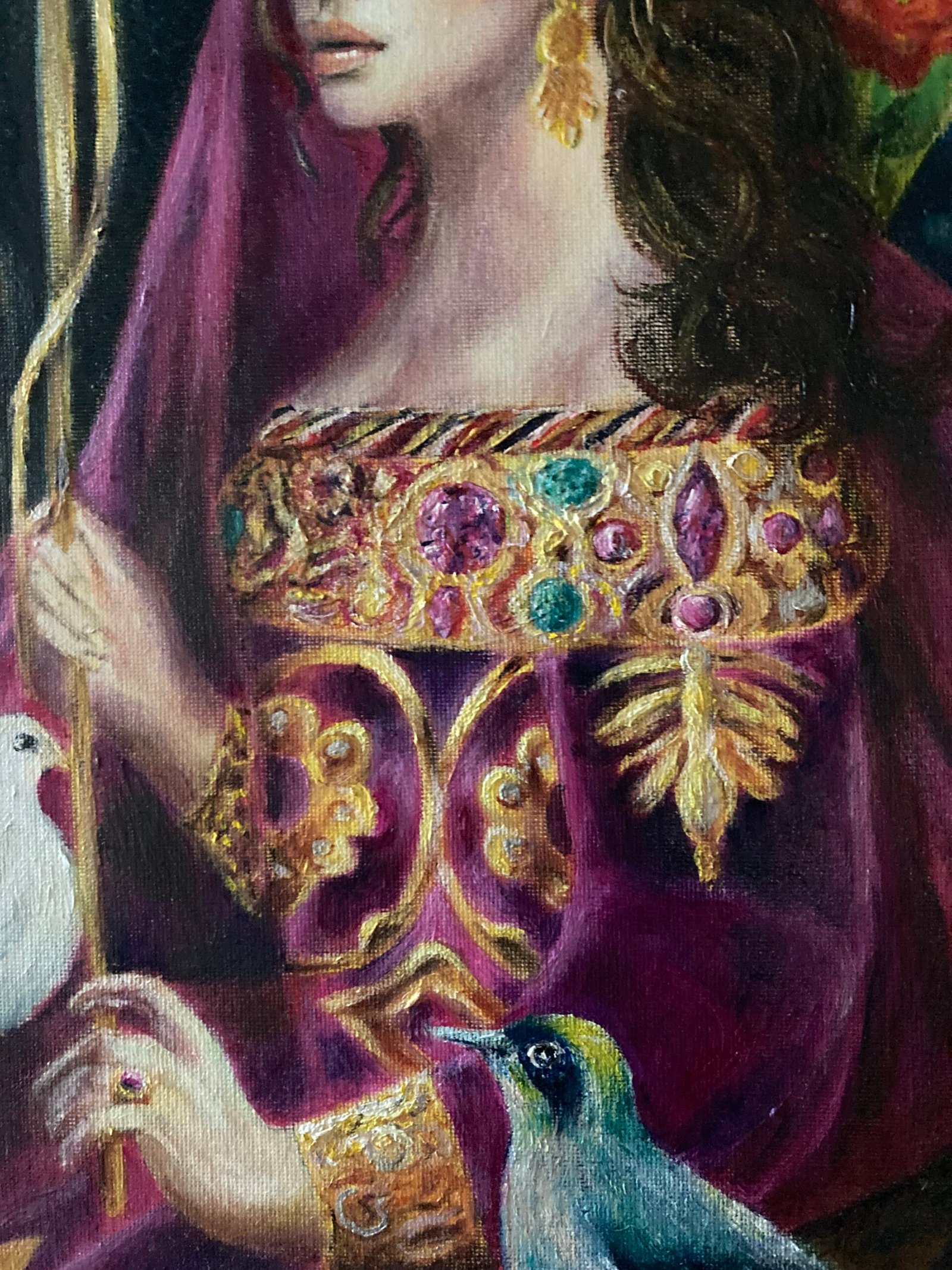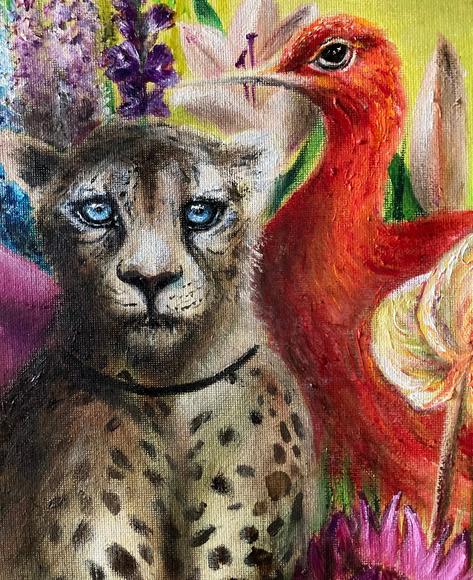 Ho tratto ispirazione dall’artista contemporanea Olga Suvorova fin da quando mi sono imbattuta nel suo “The Tamer”. Ho riempito la mia “scena fantastica” di animali e fiori, elementi caratterizzanti delle mie tele dipinte a olio.