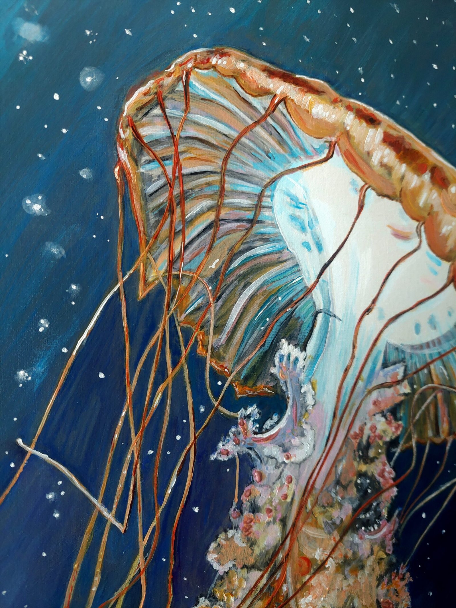 Esta obra de enfoque naturalista captura con gran detalle la majestuosidad de una medusa flotando en aguas profundas. La representación minuciosa de los tentáculos y la textura translúcida del cuerpo refleja un profundo respeto por la belleza de la naturaleza. El fondo oscuro y estrellado, que sugiere la inmensidad del océano, contrasta con los tonos cálidos y suaves de la medusa, creando una atmósfera serena y etérea que invita a contemplar la delicadeza y el misterio del mundo marino, como un universo paralelo.