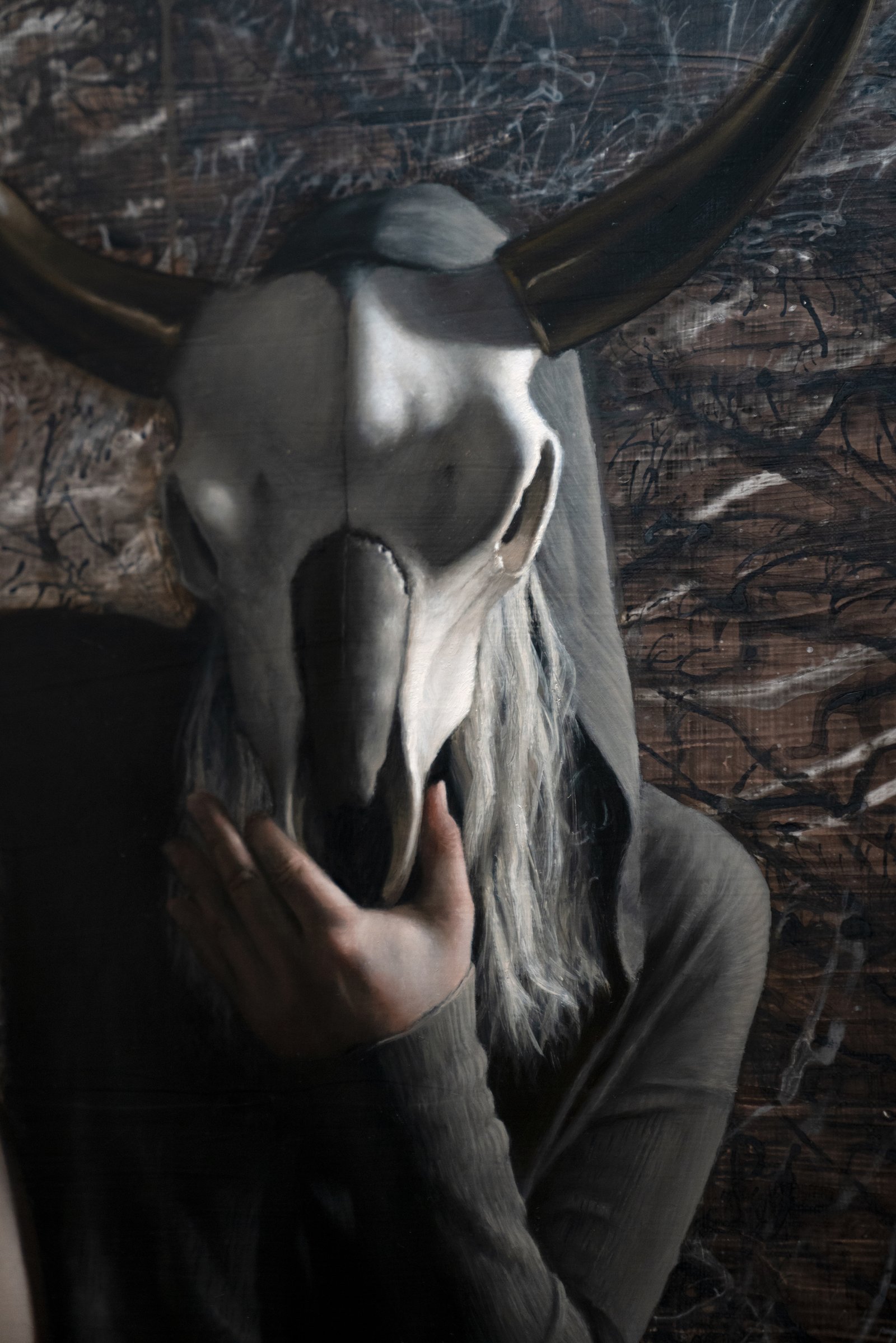 ¬¬¬Ego Mortem is an expression of the process of life and death expressed in a humanistic, anthropomorphic form. This goddess like figure is the notion that bobs and sways in and out of our awareness with a sense of strange intimacy; always at the peripheral, a constant stranger. So attached to the psyche she has become, this painting began to reflect the “little deaths” we encounter throughout the stages of life as we decay, learn, and grow along the way to our finality.
