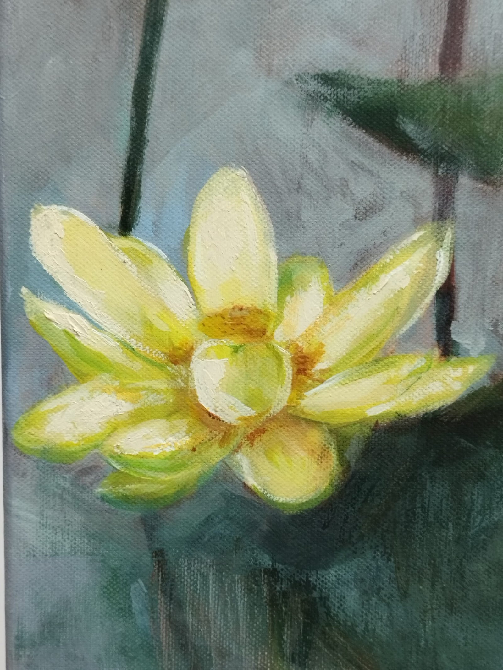 Esta pintura, inspirada en el mito de Perséfone, captura con elegancia la dualidad del viaje de la diosa entre la vida y el inframundo. El delicado equilibrio de las flores de loto—amarillas y rosas, con una en botón a punto de abrirse—simboliza la naturaleza cíclica del renacimiento y la renovación de Perséfone. El prominente lirio de agua azul, acompañado de hojas verdes exuberantes, evoca una sensación de crecimiento y tranquilidad, mientras que el fondo en tonos azulados y grises simula la calidad etérea de los reflejos en el agua. La mezcla de elementos figurativos y espontaneidad abstracta en la pintura refleja la transición de Perséfone de las limitaciones del inframundo a la libertad del mundo natural, encarnando tanto la profundidad de su mito como la fluidez de la belleza natural.