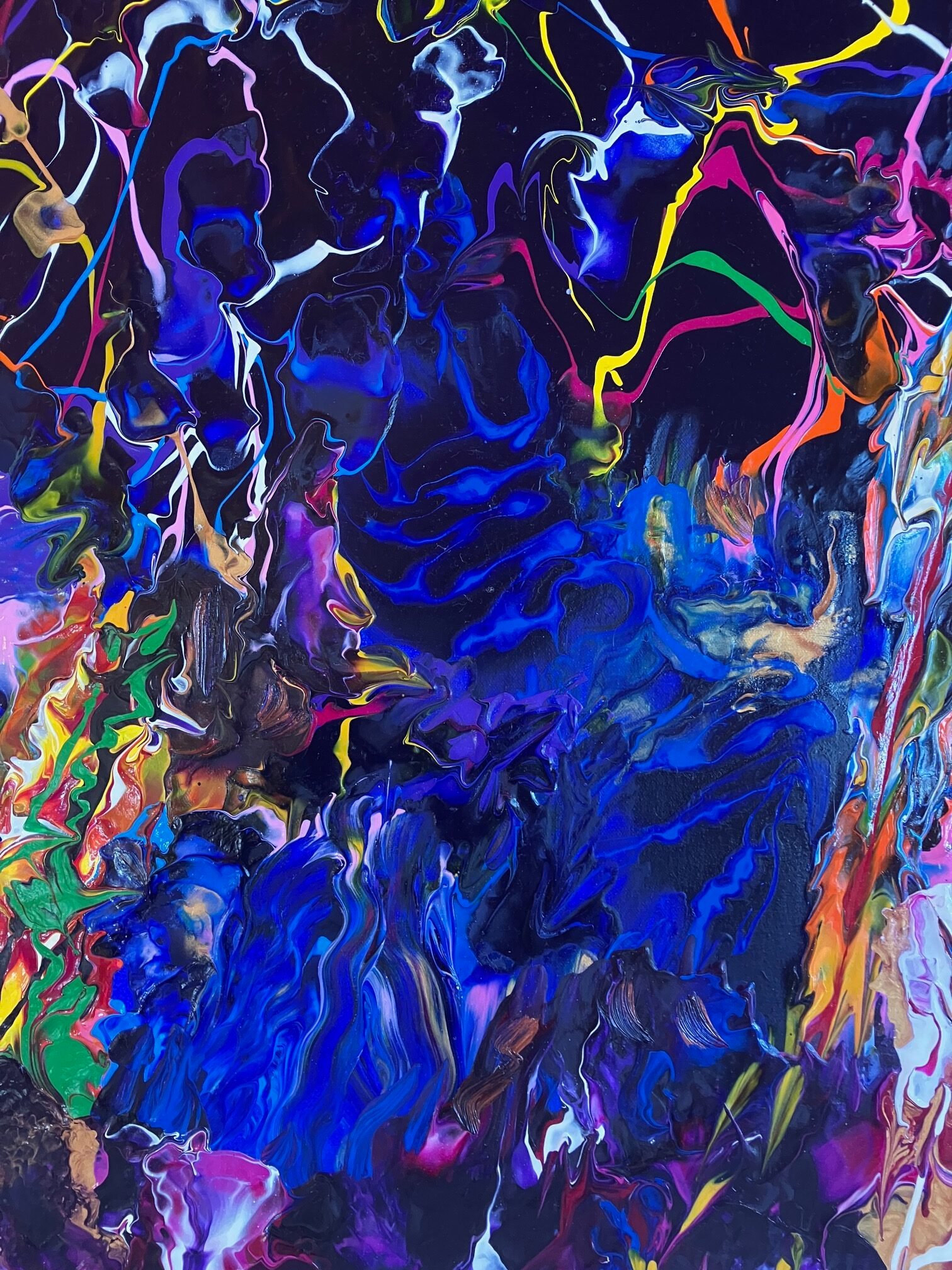 An inspiration for this series was the arrival of the comet Neowise which flew by Earth in mid July 2020. It will return in 6,800 years. An icy space rock visible to the naked eye all night and early mornings, I could see it from my studio window . I was fascinated by this white glow of compacted ice hanging in the same spot for a few weeks. Then suddenly, one evening, it was gone! I felt sad – I wanted to hitch a ride and explore the universe. My Electric Storm paintings express my journey across the skies. They are also inspired by storms, sheet lightning and thunder, so much noise and discord.