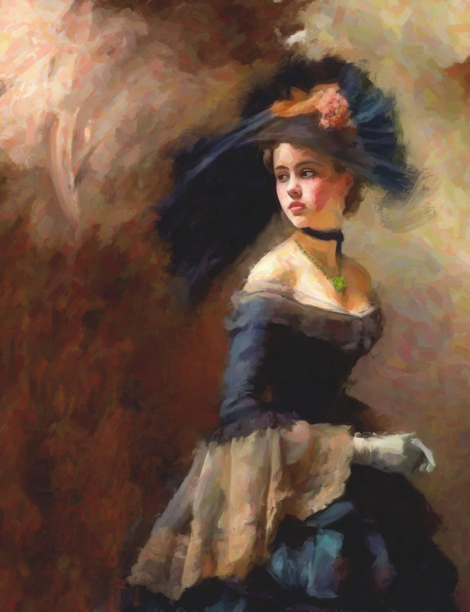 This oil painting captures a moment of poised grace as a young woman, dressed in a lavish gown, turns her gaze to the side, seemingly lost in thought. Her attire, rich in deep blues and accented with delicate lace, evokes a sense of refined elegance. The large, ornate hat she wears, adorned with a soft plume, adds to her timeless allure. The background, rendered in warm, muted tones, subtly blends into the figure, creating a harmonious balance between subject and space. The soft brushstrokes and interplay of light and shadow emphasize her delicate features and the fluidity of her movement, conveying a sense of both mystery and sophistication. The artwork invites viewers into a bygone era, where beauty and elegance are captured in every detail.