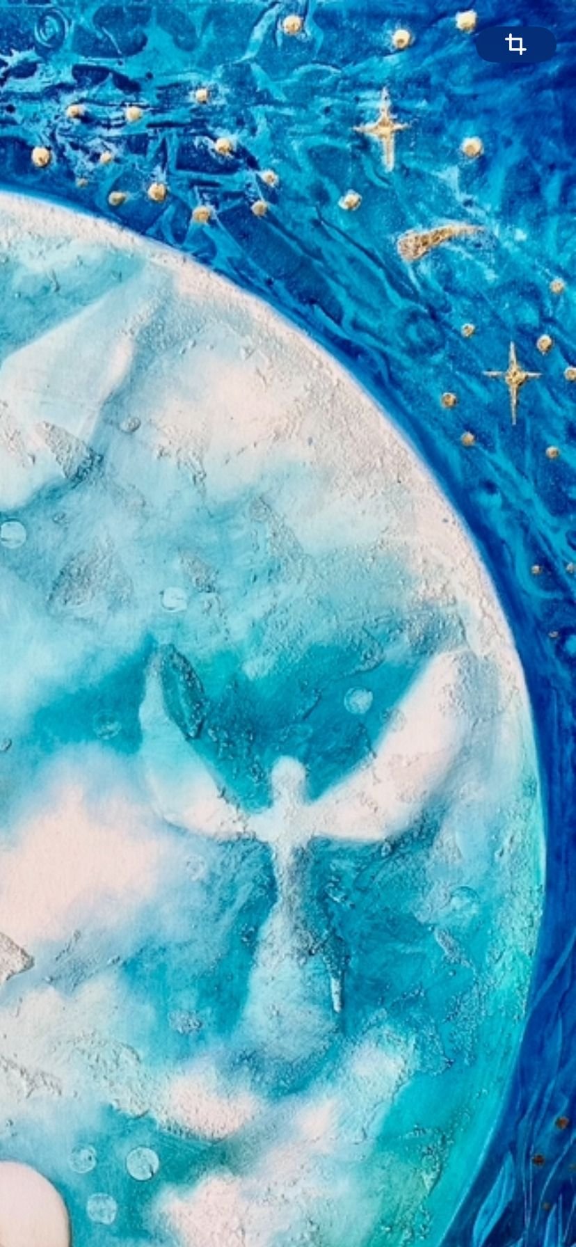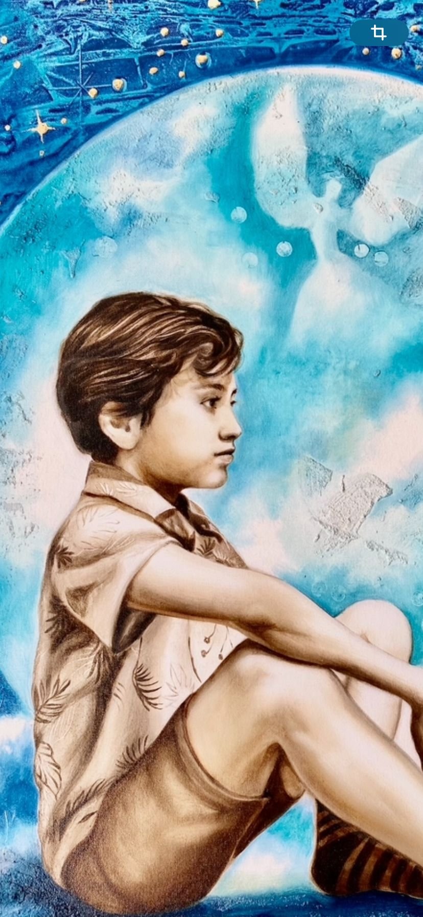 Esta pintura al óleo sobre lienzo, hace parte de la Serie “Seres de luz”, es una obra profundamente emotiva que refleja el vínculo especial entre la artista y su hijo, quien es el protagonista de la composición. El fondo de la obra introduce un elemento trascendental: la gran esfera azul que envuelve al niño, la cual simboliza la luna y un espacio de protección y espiritualidad. Dentro de esta esfera, emergen siluetas de ángeles, que parecen acompañarlo en silencio. Estas figuras etéreas evocan una sensación de resguardo y misticismo, como si la madre quisiera plasmar en la obra una presencia espiritual que vela por su hijo. El uso del azul profundo con destellos dorados en la parte superior añade un toque celestial, casi cósmico, reforzando la idea de que el niño no está solo, sino rodeado de seres de luz que lo guían y lo protegen. Este detalle puede interpretarse como una metáfora del amor maternal, que trasciende lo físico para convertirse en una fuerza omnipresente y eterna.