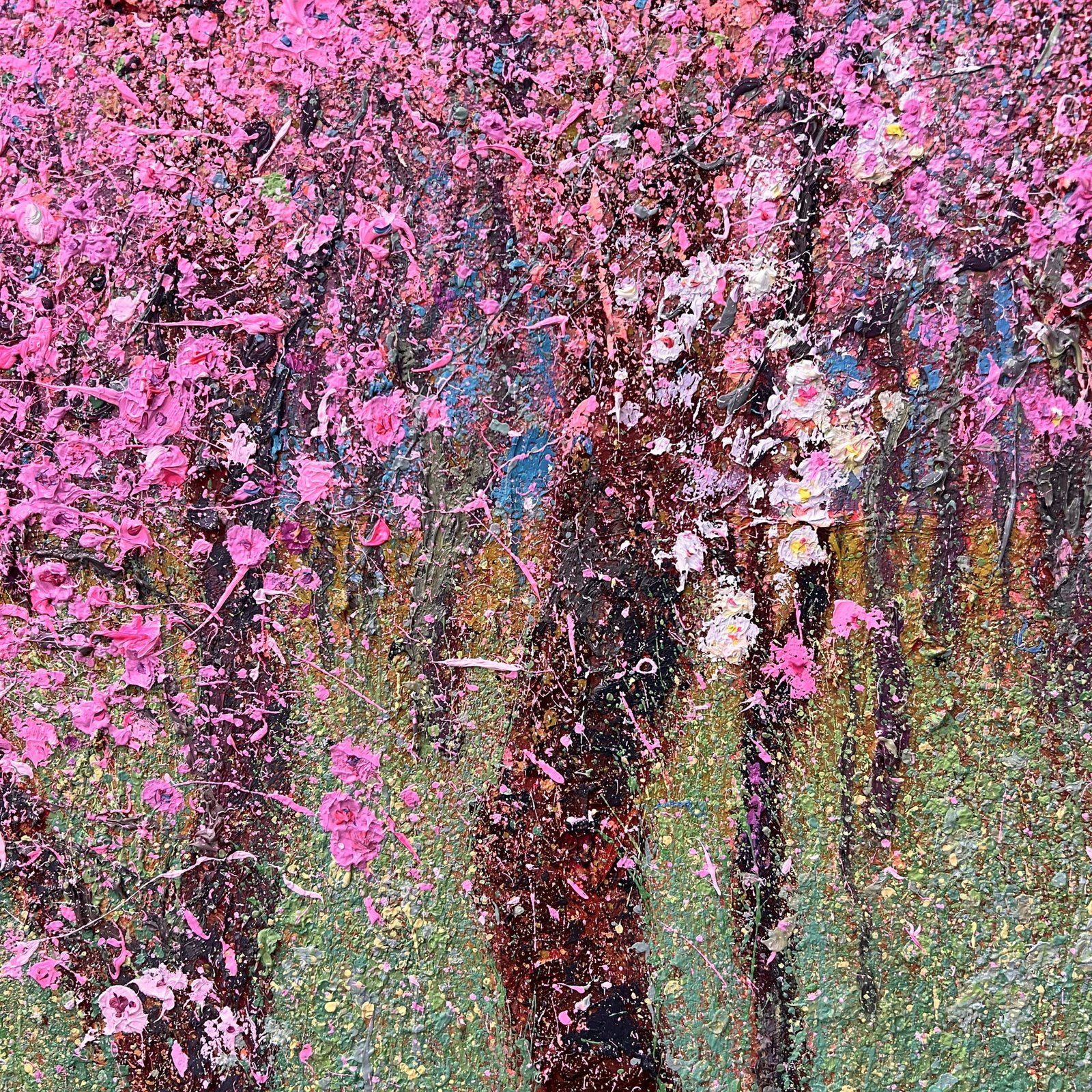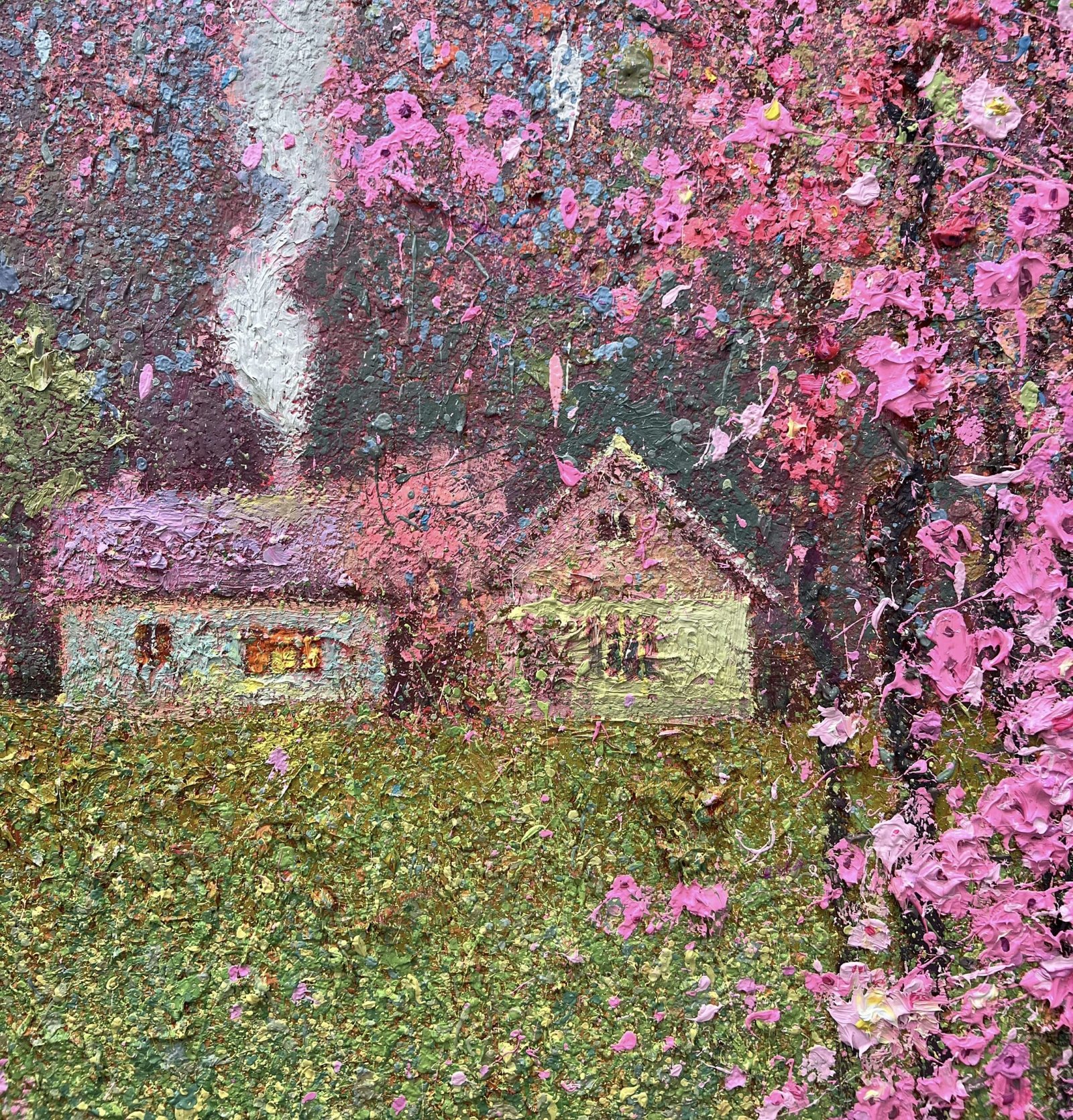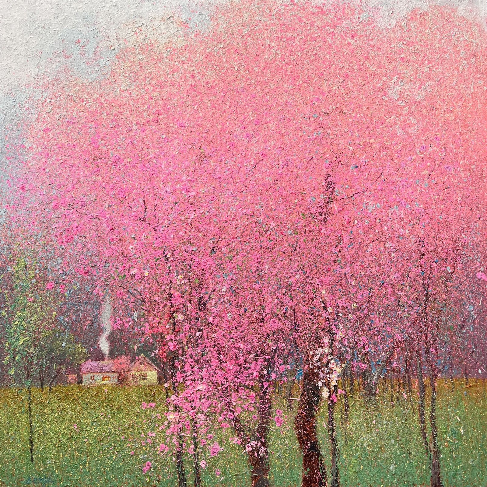 Spring is an explosion of life, a awakening of nature, and a renewal of the soul. This painting captures that moment through the vibrant pink blossoms, which seem to scatter through the air, filling the space with light and movement. The warm tones of the grass and sky create a balance between calmness and dynamism, while the cozy house with smoke in the distance symbolizes harmony between humans and nature. This artwork does not merely depict spring—it radiates its energy, charging the viewer with a sense of joy, inspiration, and renewal.