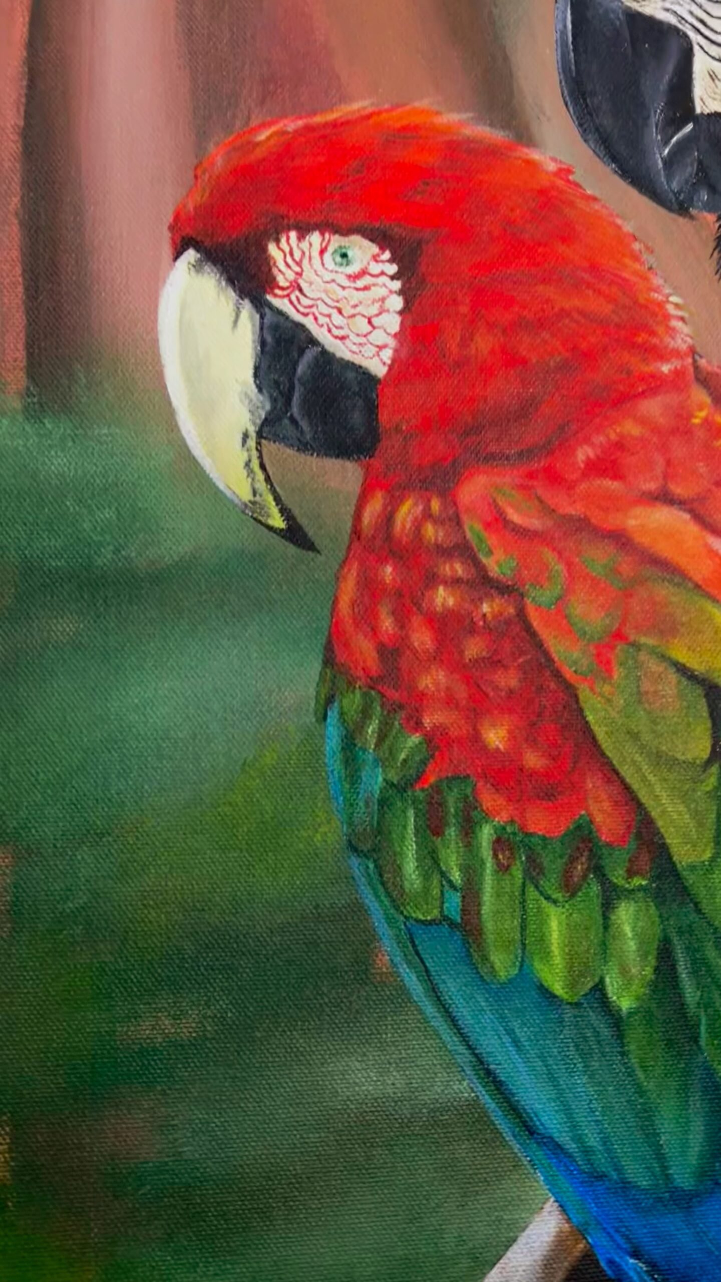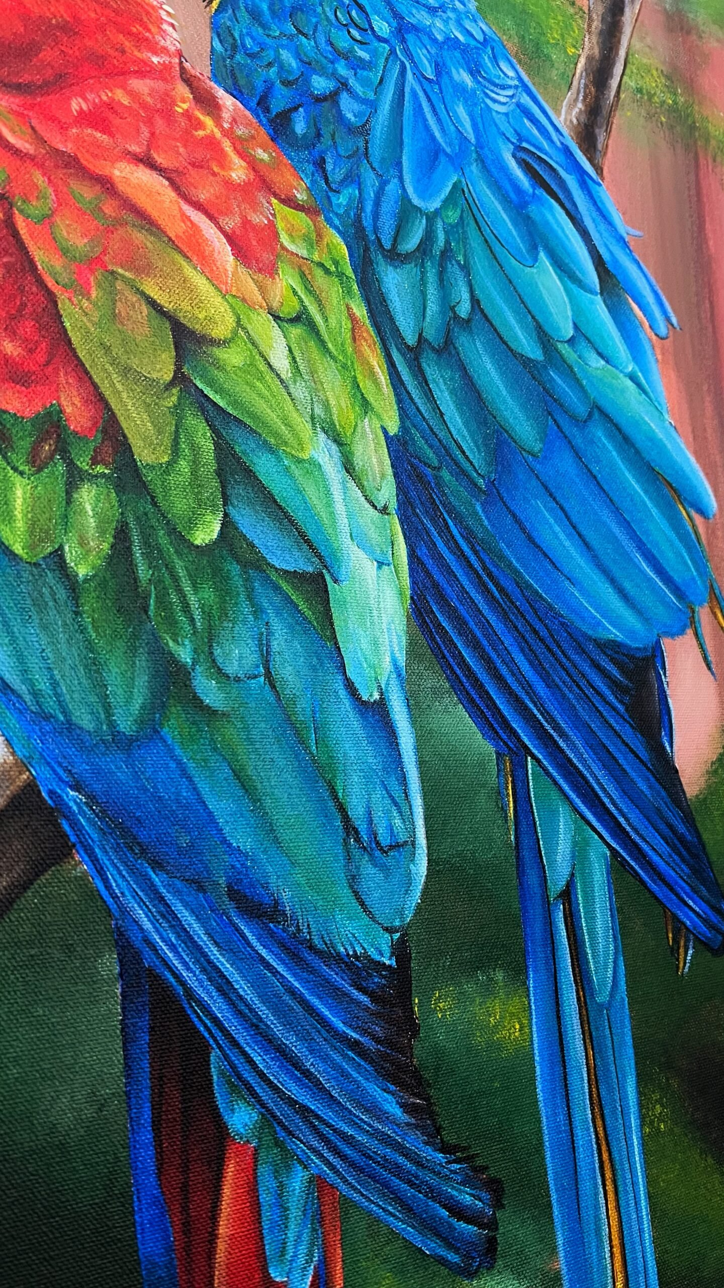Il dipinto, realizzato con colori acrilici su una tela di 70 x 100 cm, cattura con straordinaria vivacità e dettaglio due magnifici esemplari di pappagalli esotici: Estrella, un Ara macao dal piumaggio fiammeggiante, e Paco, un Ara ararauna dai colori intensi e contrastanti. L’opera trasmette l’essenza della natura tropicale, evocando i colori e l’atmosfera della Repubblica Dominicana, in particolare di Bayahibe, il luogo in cui questi due splendidi uccelli sono stati incontrati e osservati. “Estrella e Paco” non è solo un omaggio alla bellezza della natura caraibica, ma anche un ritratto di un incontro speciale con due creature affascinanti e intelligenti. L’opera invita lo spettatore a immergersi in un angolo di paradiso tropicale, a sentire il fruscio delle foglie e il canto degli uccelli. Una celebrazione della natura e del legame profondo che può nascere tra uomo e animale in luoghi dove la bellezza selvaggia regna sovrana.