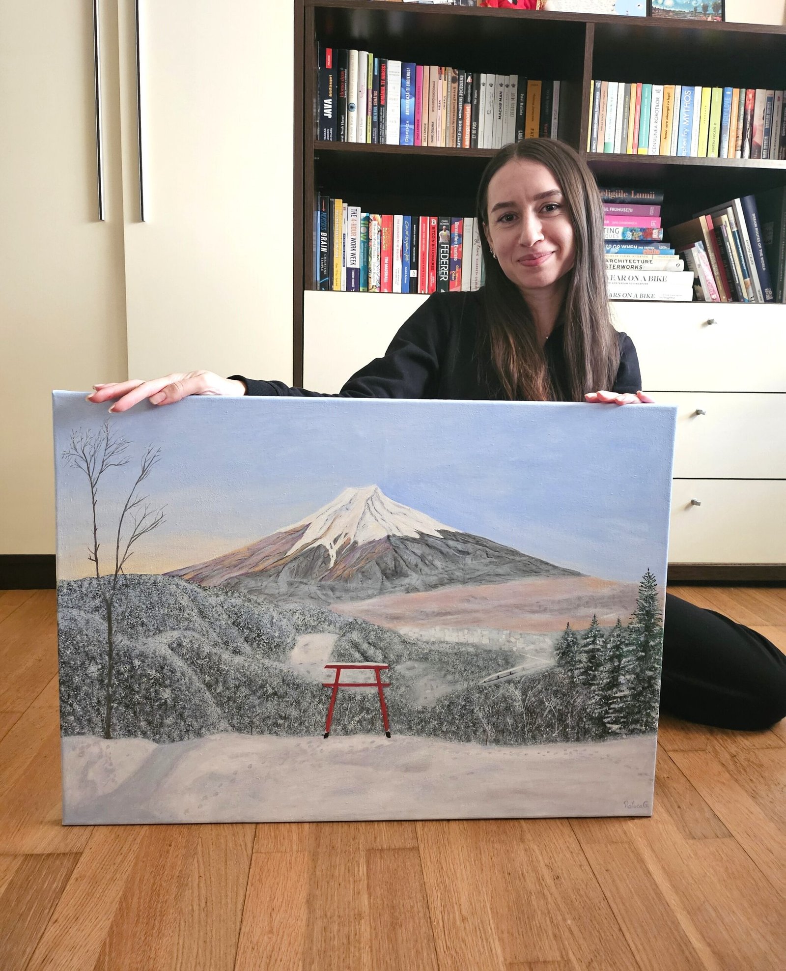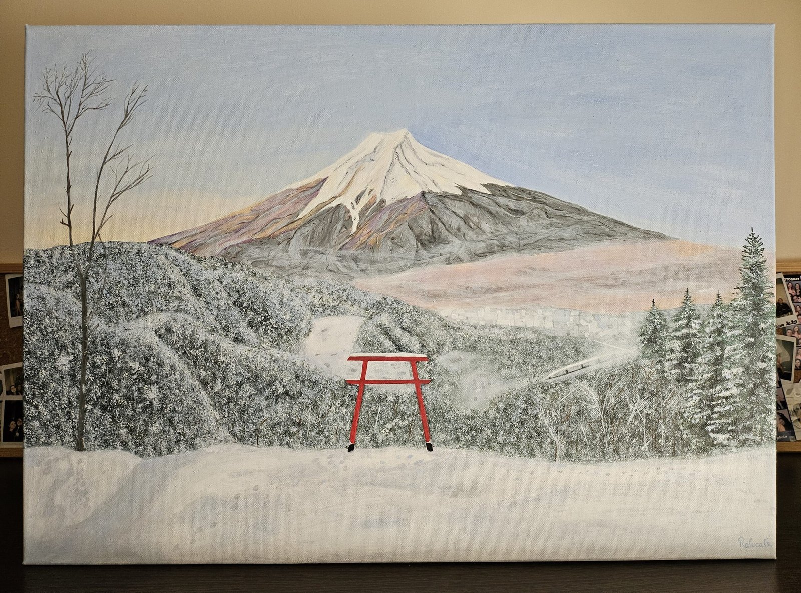 A symphony of snow and serenity, this acrylic painting intertwine the cool tranquility of a winter landscape with the vibrant warmth of the sunset, creating a moment of quiet power and ethereal beauty.