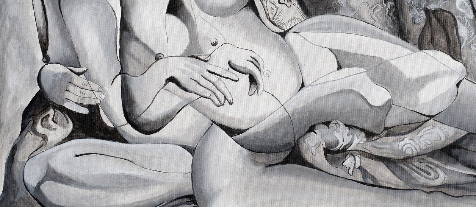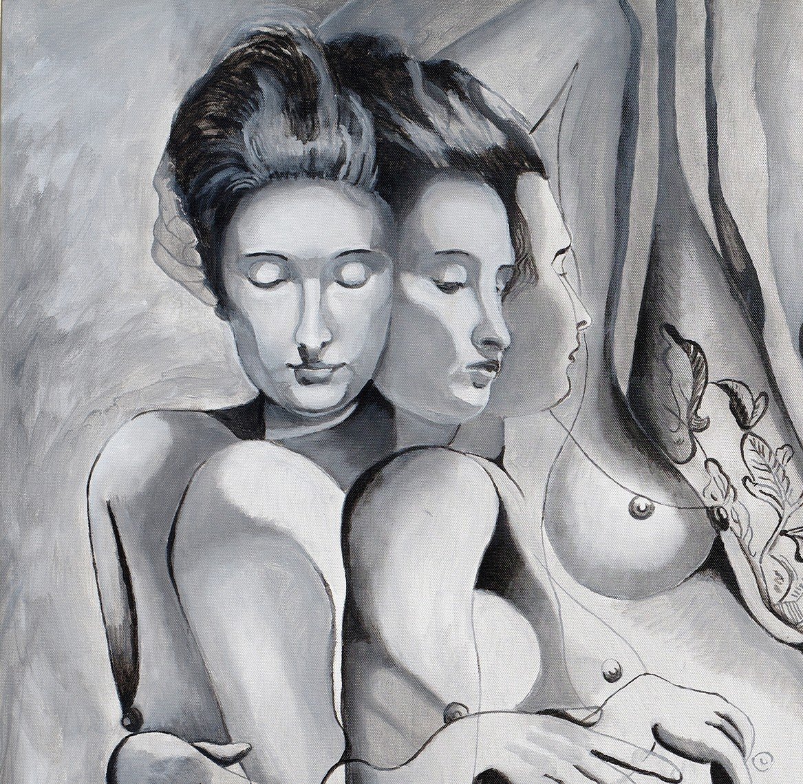 The image depicts Gaea the Goddess of the earth reclining. This painting addresses the much-used image of the reclining nude female throughout art history. My interpretation is of a female nude seen from three angles at once. The juxtaposition of the three images can create more than more figures when viewing from different angles. The movement of the lines is very important creating their own abstraction. The movement of the different angles of the heads, hands, legs and feet create a form of composition in relation to music. This creates a three-dimension image within the picture plane. The painting was retouched and updated in 2024.