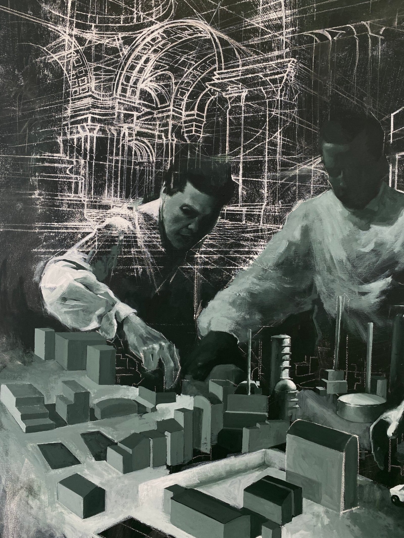 Esta obra pertenece a la serie de pinturas "In the name of progress". La evolución tecnológica se halla supeditada a los intereses de un grupo reducido de individuos que ostentan el poder de configurar el futuro de la humanidad. Estas élites, al margen de la voluntad popular, son las responsables de definir las políticas públicas en materia social, ambiental y tecnológica. La exclusión de la ciudadanía de los procesos de toma de decisiones fundamentales socava los principios democráticos y genera una creciente sensación de desconexión entre los gobernantes y los gobernados. El mencionado desarrollo tecnológico, lejos de ser un proceso participativo, se ha convertido en un instrumento de poder en manos de estos arquitectos del futuro que moldean el mundo a su antojo, trazando los mapas del progreso y definiendo los parámetros de lo posible. Además, esta toma de decisiones a menudo es llevada a cabo a espaldas de los ciudadanos.