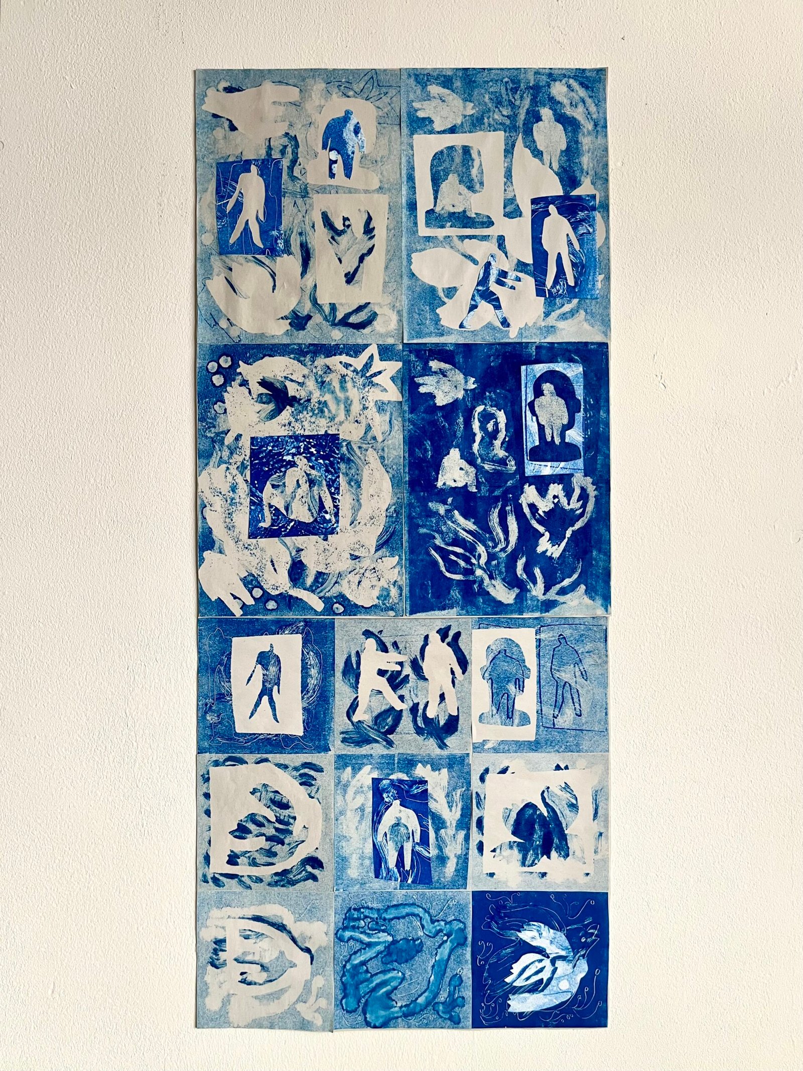 Growing In Blue is an exploration of fragmented narratives, reconstructing the perception of emotions and memories through a nonlinear storytelling approach. In this project, I use block-like prints as visual metaphors for emotional fragments—pieces that can be rearranged freely to generate new narratives. Small human figures appear throughout the compositions, symbolizing my presence as a creator navigating these emotional fragments. At the same time, these figures invite viewers to project their own experiences onto the work, allowing for multiple interpretations. The color blue, often associated with melancholy, serves as the foundation of this project. Growing in Blue represents my process of growth within this color—blue as sorrow, but also as a quiet form of anger, a state of reflection, and even a sense of calm. Moving through blue, I express, confront, and transform my emotions, letting them take shape through printmaking and collage.