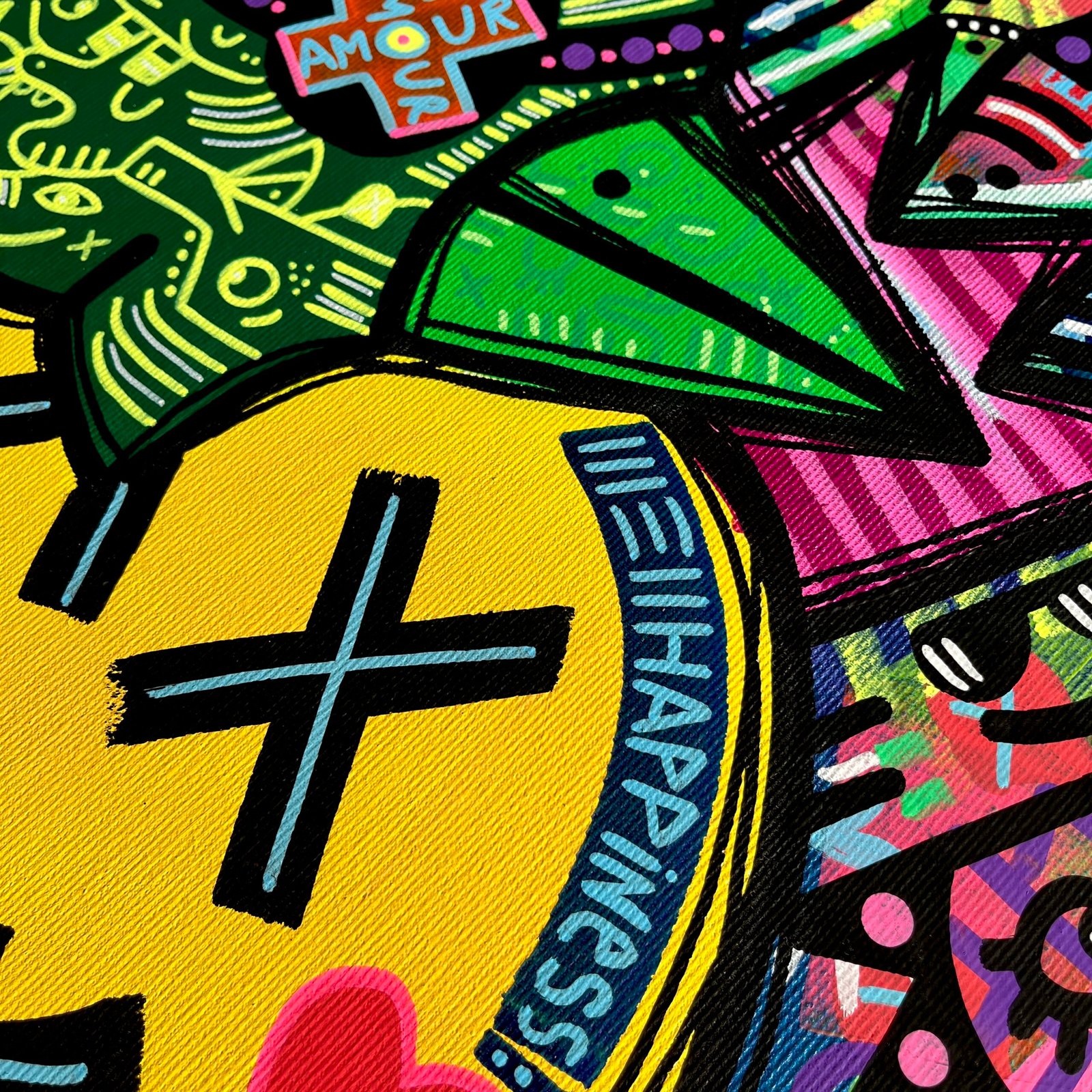 HAPPINESS est une oeuvre sur le thème de l'amitié et du bonheur. Comme chacune de mes oeuvres, elle est composée de trois plans. Je commence par réaliser un fond à l'acrylique et au spray avec des couleurs vives et fluorescentes et je viens étaler puis racler pour lui donner un aspect "grunge". Ensuite, le second plan, est composé de mes personnages, que je nomme les POP'Monsters, ainsi que de plusieurs petits mots joyeux que j'écris ici et là. Enfin, je termine en recouvrant ma toile de centaines de Pop'Monsters au contour noir. J'aime beaucoup l'idée de découvrir et redécouvrir des messages cachés à l'intérieur des mes toiles. Quand je peins, je souhaite propager la bonne humeur et apporter de la joie autour de moi. J'ai crée les Pop'Monsters à la suite de divers problèmes de santé qui ont faillit me coûter la vie. Ils sont pour moi, ces petits maux que nous avons à l'intérieur de nous, et que je transpose sur la toile de façon amusante et joyeuse sous forme de petits monstres.