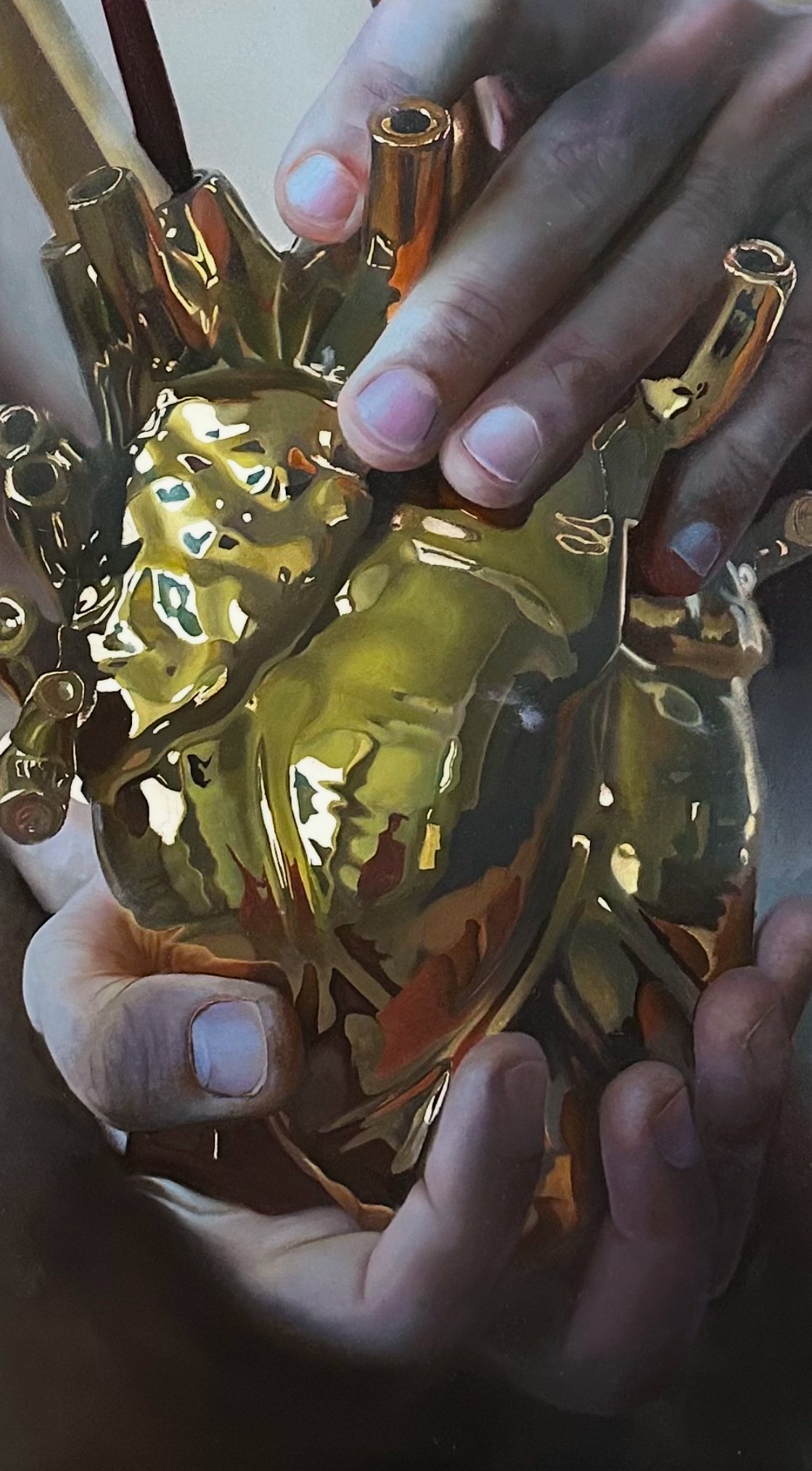 “Hearts Desire” (2025, oil on wood) explores the complex longing for love, connection, and acceptance while preserving the autonomy and independence central to the artist’s identity. Through a powerful and intimate portrayal, the piece reflects the tension between vulnerability and self-protection, examining what it means to embrace one’s deepest yearnings without sacrificing personal freedom. “Desire” invites viewers to confront their own needs for connection and self-empowerment, creating a space where individuality and intimacy can coexist.