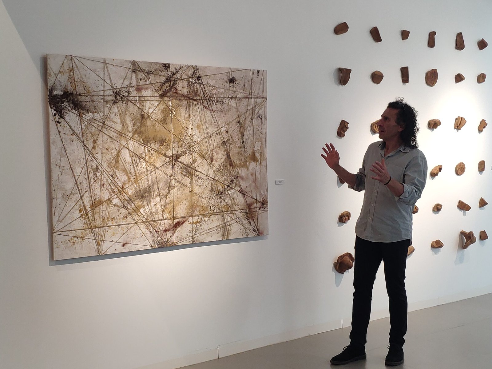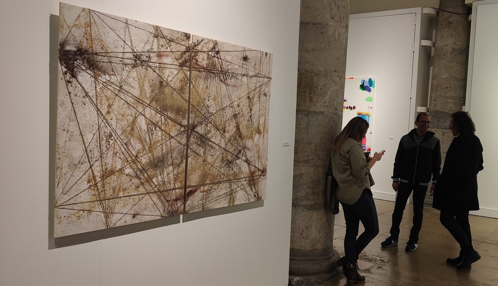 Integración es un sugerente díptico cuyas dos mitades constituyen la unidad de una nebulosa de polvo y arena sobre la cual se proyectan una profusión de líneas e hilos que confluyen para formar una multitud de puntos de fuga que llevan al espectador a observar las zonas de confluencia, conformando así una visión convergente, con la que se obtiene un efecto espacial y tridimensional que colabora para que nos introduzcamos en un terreno donde los triángulos aparecen como símbolos de integración de los opuestos. Opuestos que a su vez forman parte de un todo.