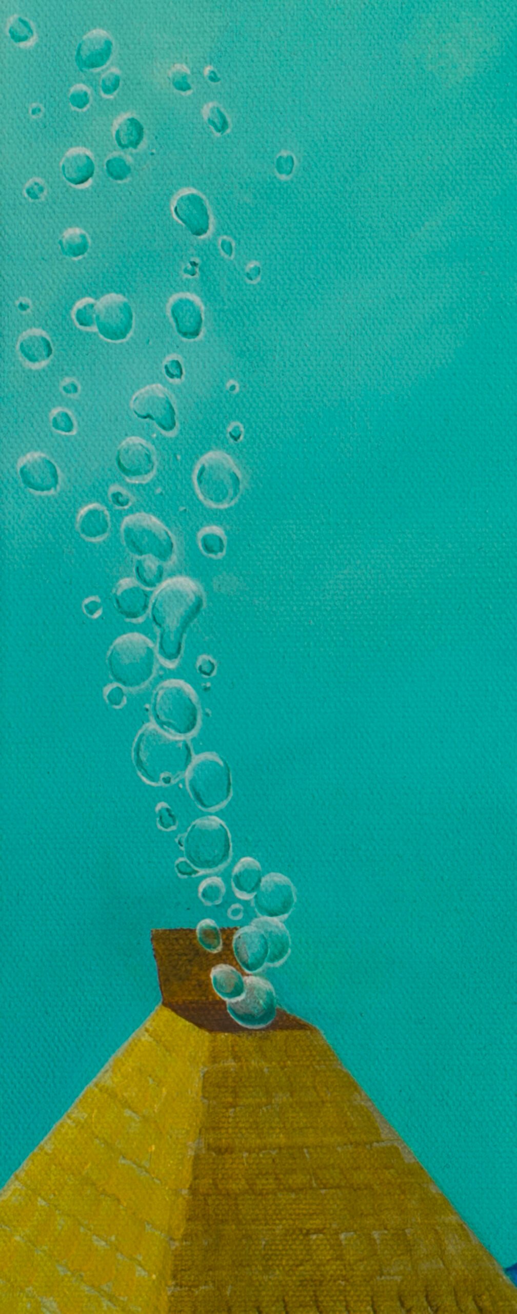 The scene takes place in an aquarium, that of an owner in love with Egypt who owns a cat (sphynx) and an exotic fish in the colours of the Pharaohs' Nemes. According to my own artistic approach, it depicts the secret jealousy of the sphynx towards this fish ‘pampered’ by Egyptian breliques and thus becoming more ‘Egyptian’ than it is. The aquarium is decorated to resemble the Giseh of today, with its two great pyramids, Khéops and Khéphren, and the Sphynx personified by the cat itself. The scene also features Osiris and Anubis in a rite of psychostasy, but it is not clear whether this is a daydream longed for by the jealous Sphynx or a composition of the aquarium as simple plastic figurines.