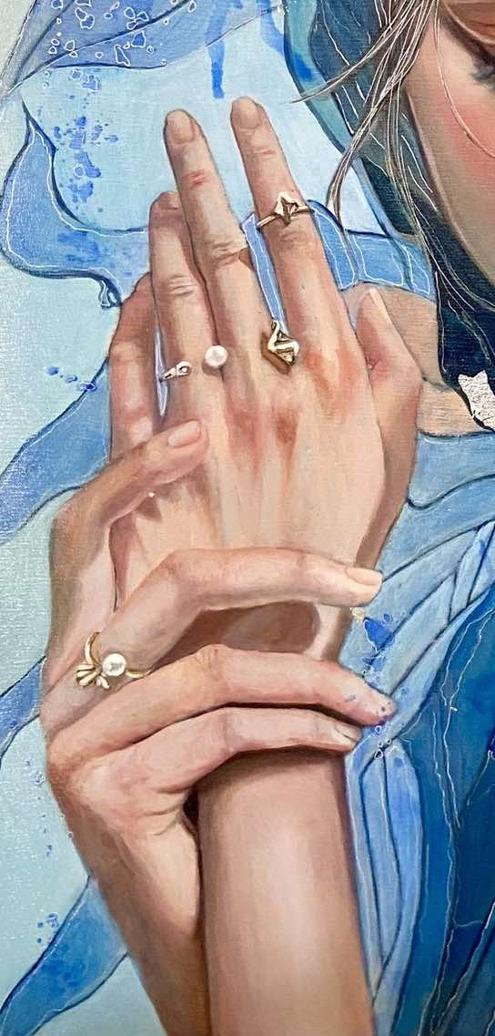 "La dama de los tules azules" Transparencia 6 forma parte de una serie donde se realza la imagen femenina por lo general empoderada, glamurosa y un tanto sofisticada . Es una obra que yo considero de Realismo Mágico donde trabajo el rostro y las manos de forma tradicional clásica , para posteriormente dejarme llevar por la mancha, la transparencia y el papel de plata.