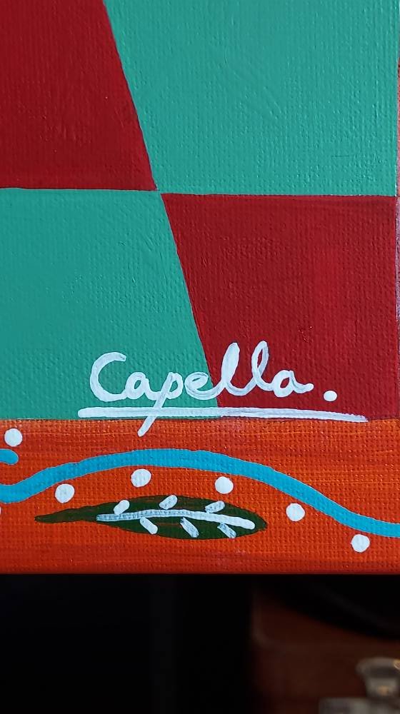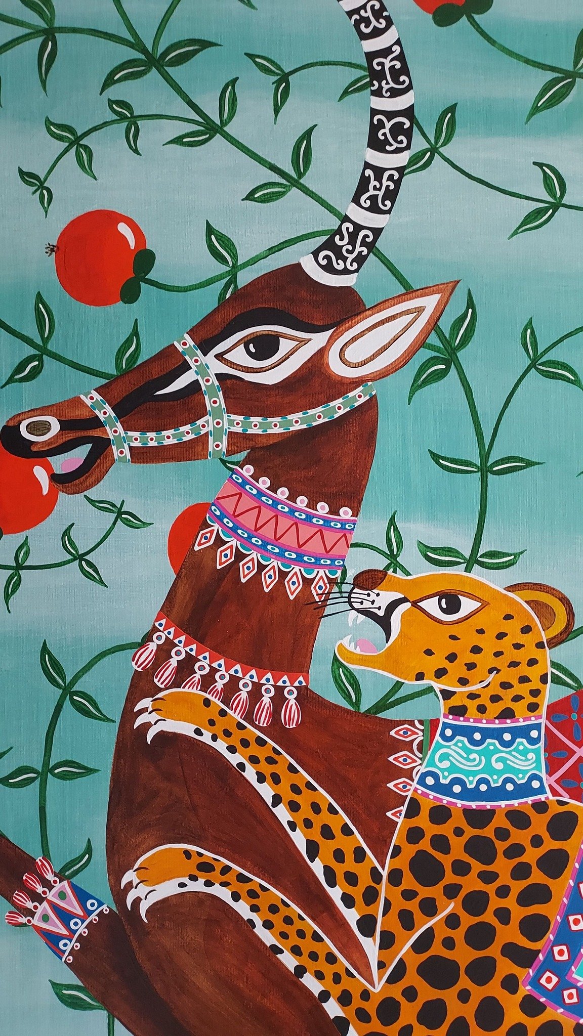 En esta obra, se plasma una fusión entre la fuerza instintiva de los animales y la estética evocadora del arte contemporáneo, reinterpretando el momento crucial de un jaguar cazando a una gacela. Lejos de la crudeza típica de esta escena, la pieza transforma la interacción en una danza visual, donde patrones geométricos y figuras estilizadas generan un impacto hipnótico. El jaguar, símbolo de poder y agilidad, se entrelaza con la gacela en un instante suspendido, casi coreográfico, evocando una conexión ancestral entre depredador y presa. La composición se desarrolla en un escenario onírico: un suelo que recuerda a un tablero de ajedrez y un trasfondo de ramas y frutos que enmarcan la acción, confiriéndole un aire de fábula y misticismo. La ornamentación detallada de los cuerpos de los animales, inspirada en tradiciones artísticas de culturas ancestrales del pasado.