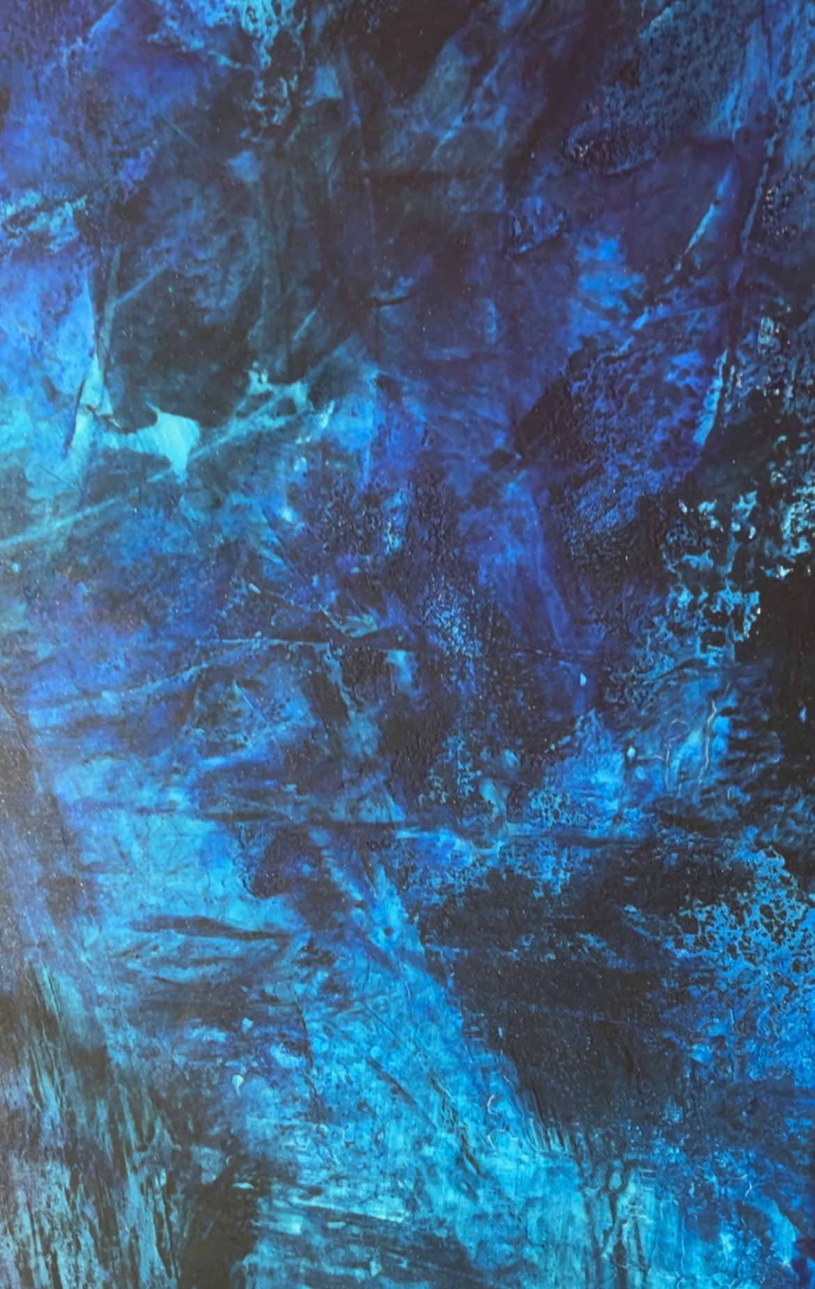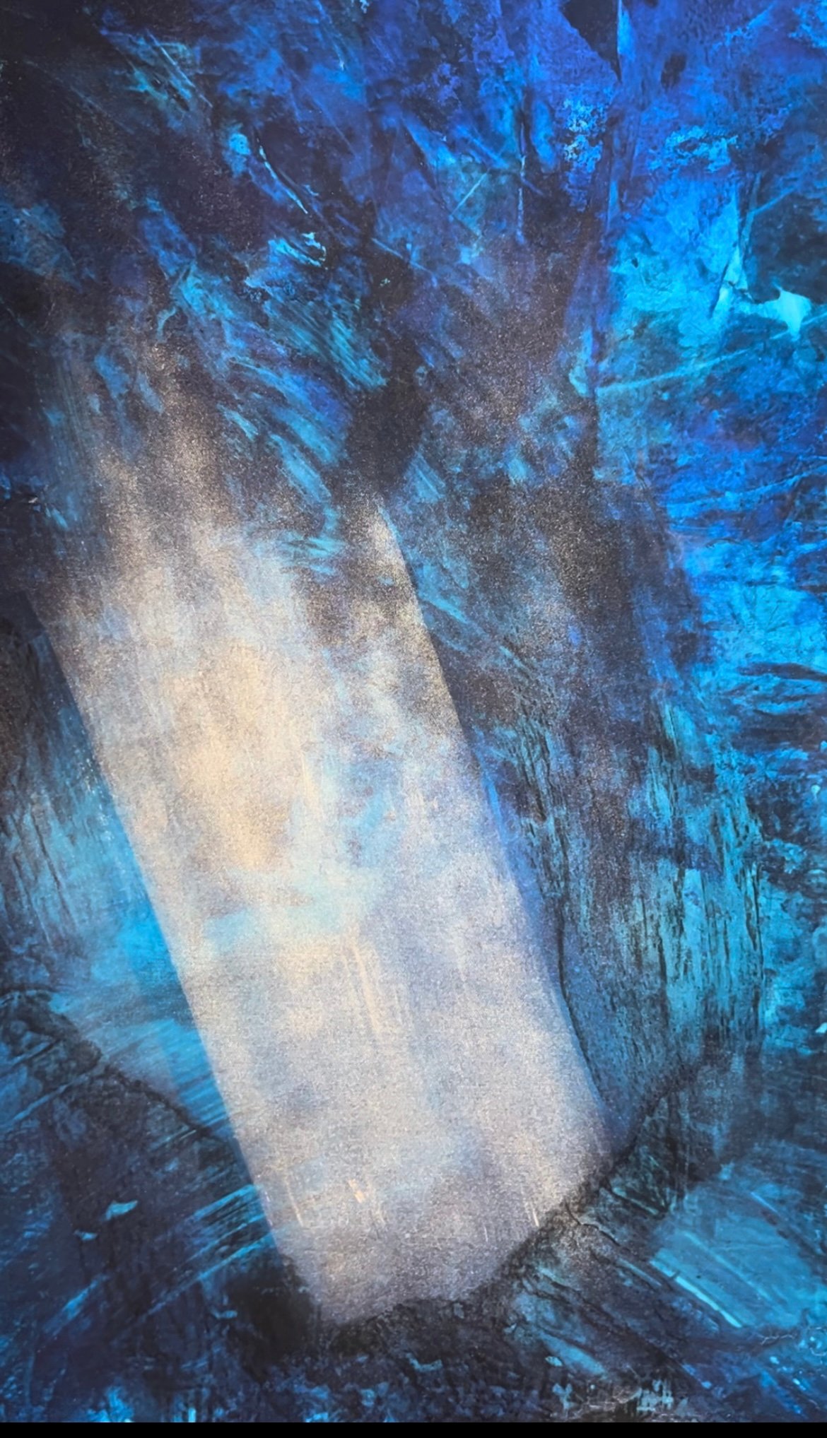 The artwork was created intuitively, and for some reason, the colors ended up being shades of blue and black. However, I wanted to add some light to the piece, so I painted light beams to bring it to life, which is how the name of the artwork came from this light effect.