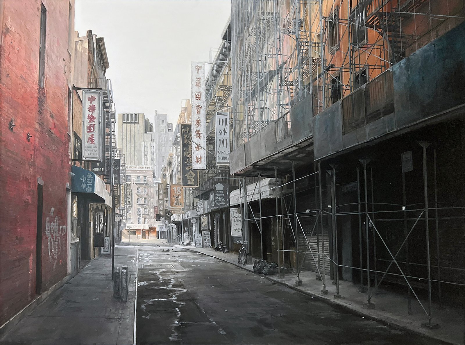 Longline building ecosystem, es un instante irrepetible en una conocida calle de chinatown en Manhattan, en el fondo de la escena se encuentra Longline building como un tótem atemporal, observador de la vida en su entorno. La escena carece de personas para dar importancia a la arquitectura, que año tras año envejece y se renueva, en este proceso de renovación aparecen estructuras efímeras que desdibujan las fachadas y las aligeran de toda su carga histórica. Como en toda mi obra busco una armonía que pueda llegar a recordar el caos natural, buscando un punto de encuentro imposible entre la humanidad y la naturaleza, un ruido blanco universal que aun siendo caótico nos relaja.