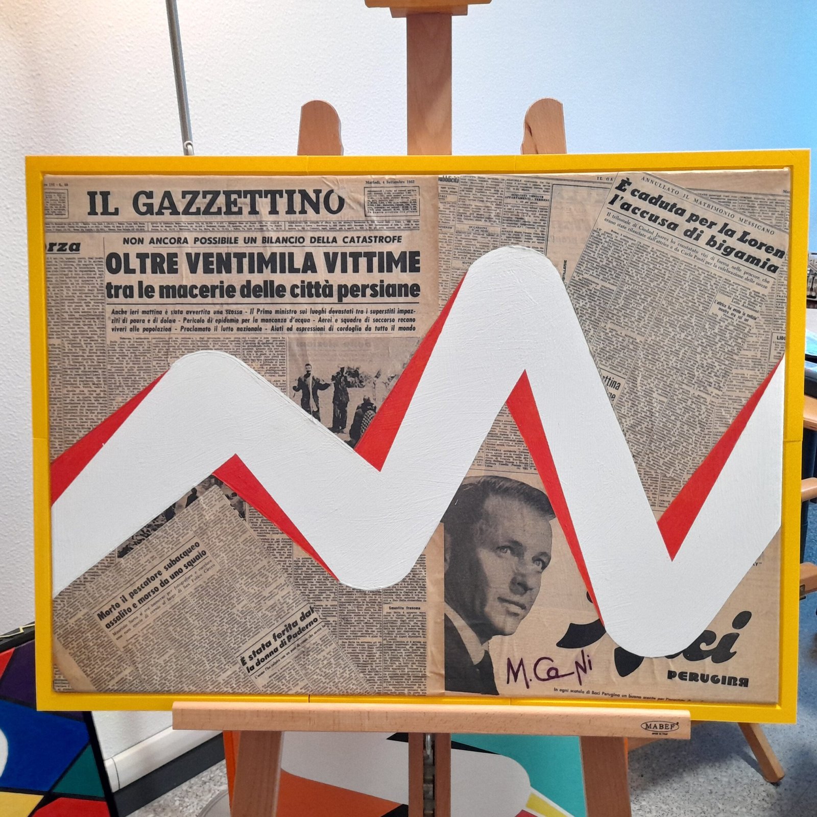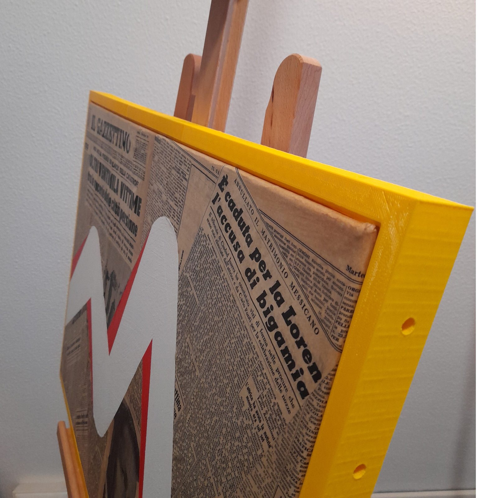 COLLAGE DI GIORNALE DEL 1962 CON CRONACA DI EVENTI DRAMMATICI. UN RAGGIO DI LUCE, LA LUCE COME ETERNA TESTIMONE DELLE COSE, OSSERVA SENZA TOCCARE O MODIFICARE GLI EVENTI. CORNICE IN PLASTICA STAMPATA IN 3D.