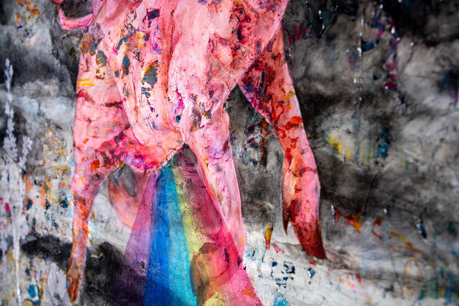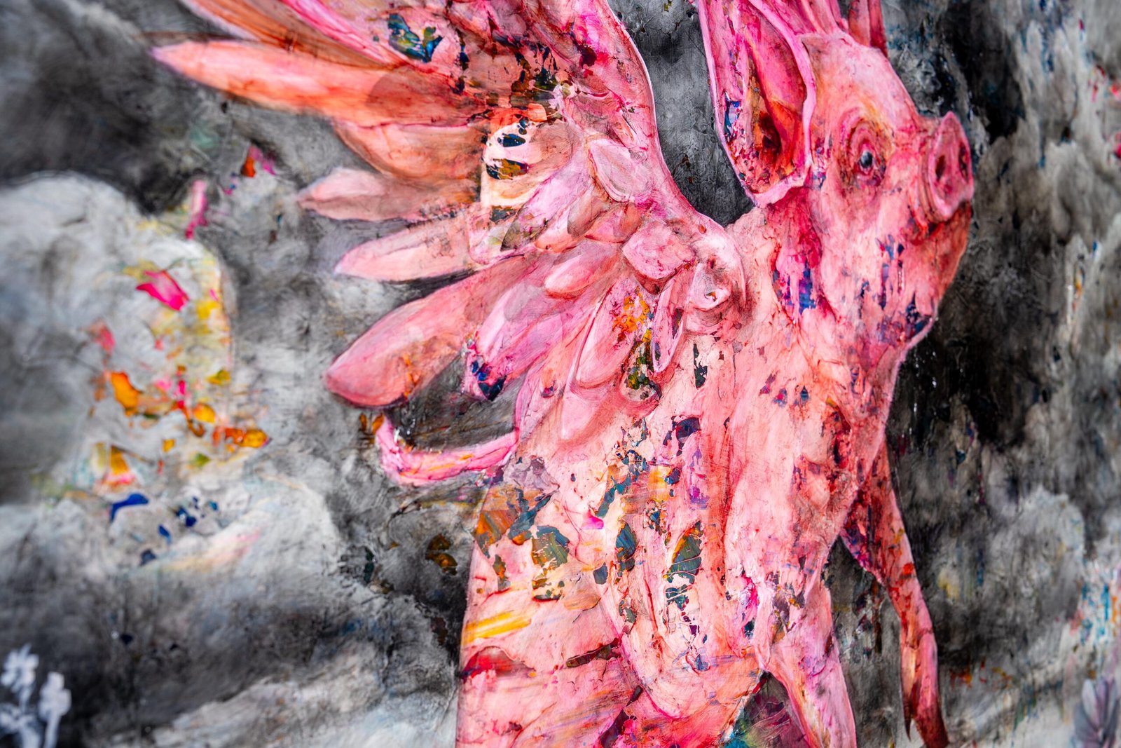 "Meraki" captures the essence of the Greek word meaning to put soul into what you do. It's part of the flying pig metaphor: The pig, traditionally associated with the earthly and the mundane, is transformed into a symbolic figure that defies the laws of gravity. Flying represents freedom, the ability to transcend the established, and the pursuit of beauty. This is symbolized by the majestic pig that flies over a black and white landscape. From her teats, a vibrant rainbow springs forth, transforming the landscape, filling it with color and life. The rainbow-milk represents the feminine energy that nurtures the world, physically, emotionally, and creatively. "Meraki" is a celebration of feminine energy to transform and give life through love and creativity.