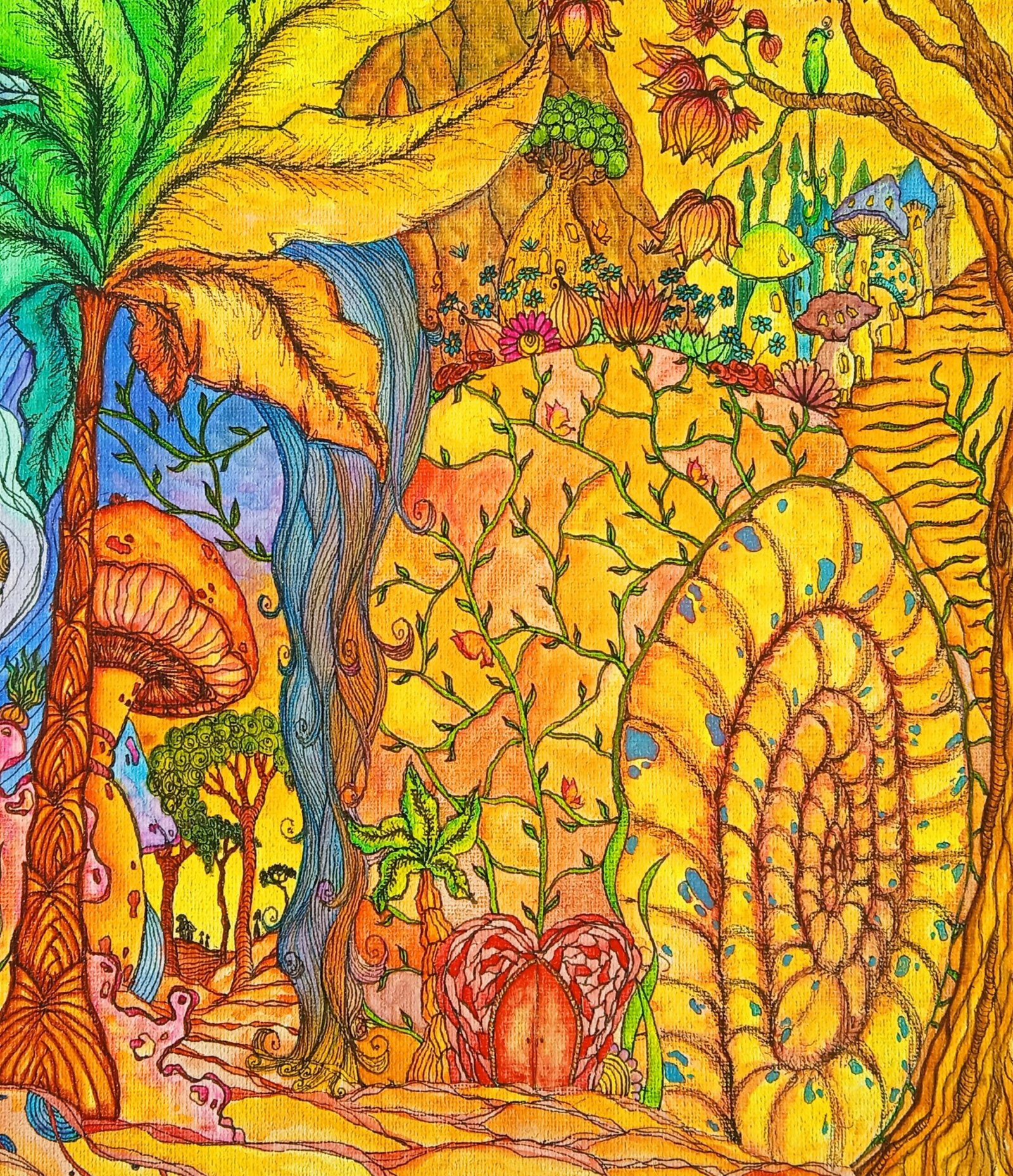 Métamorphose est une célébration visuelle du changement et de l’interconnexion entre l’humain, la nature et l’énergie vitale. La figure féminine, fusionnant avec une rivière, symbolise Gaïa et l’éternel cycle de transformation. L’arbre central, axe de l’œuvre, incarne l’équilibre entre profondeur et élévation, tandis que ses fruits flottants évoquent un potentiel en devenir. Les détails terrestres, aquatiques et aériens – champignons, racines, animaux – reflètent la richesse de l’invisible et l’interdépendance des cycles naturels. La palette de couleurs, oscillant entre tons froids et chauds, traduit la dualité entre sérénité et dynamisme, destruction et renaissance. Chaque détail invite à l’exploration, révélant la beauté du processus de transformation. Cette œuvre rappelle que le changement, bien qu’inconfortable, est une force essentielle pour grandir et se reconnecter à la nature, à soi-même et au monde.
