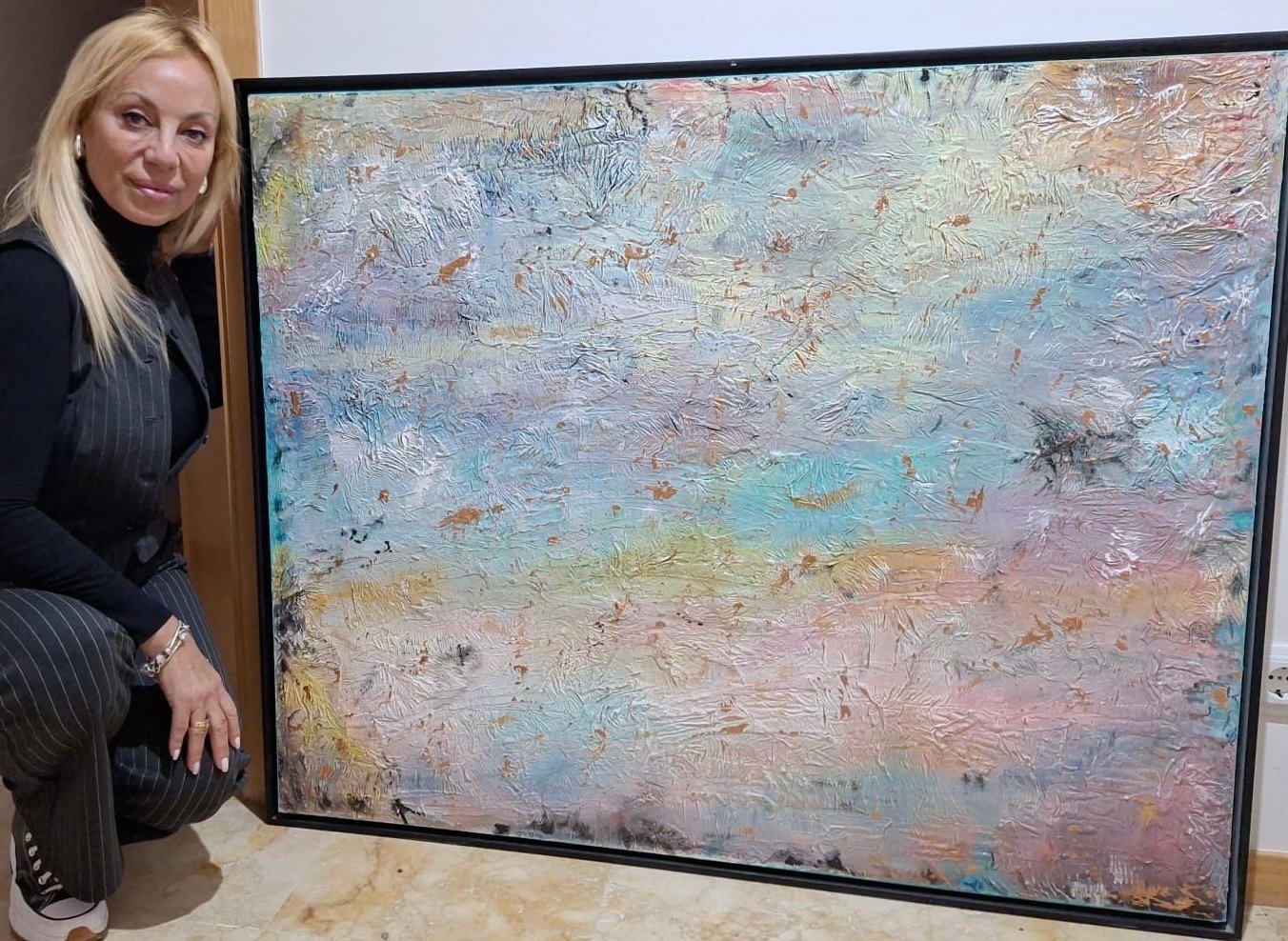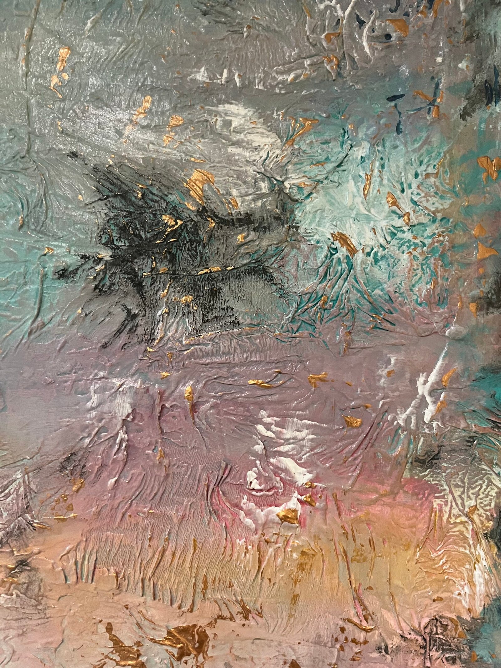 Esta obra surgió en un momento de cambios en mi vida en el que hice un viaje que me ayudo a realizar una introspectiva y plasme los colores que me iluminaron en esos momentos. Las texturas están realizadas en gesso y papel.