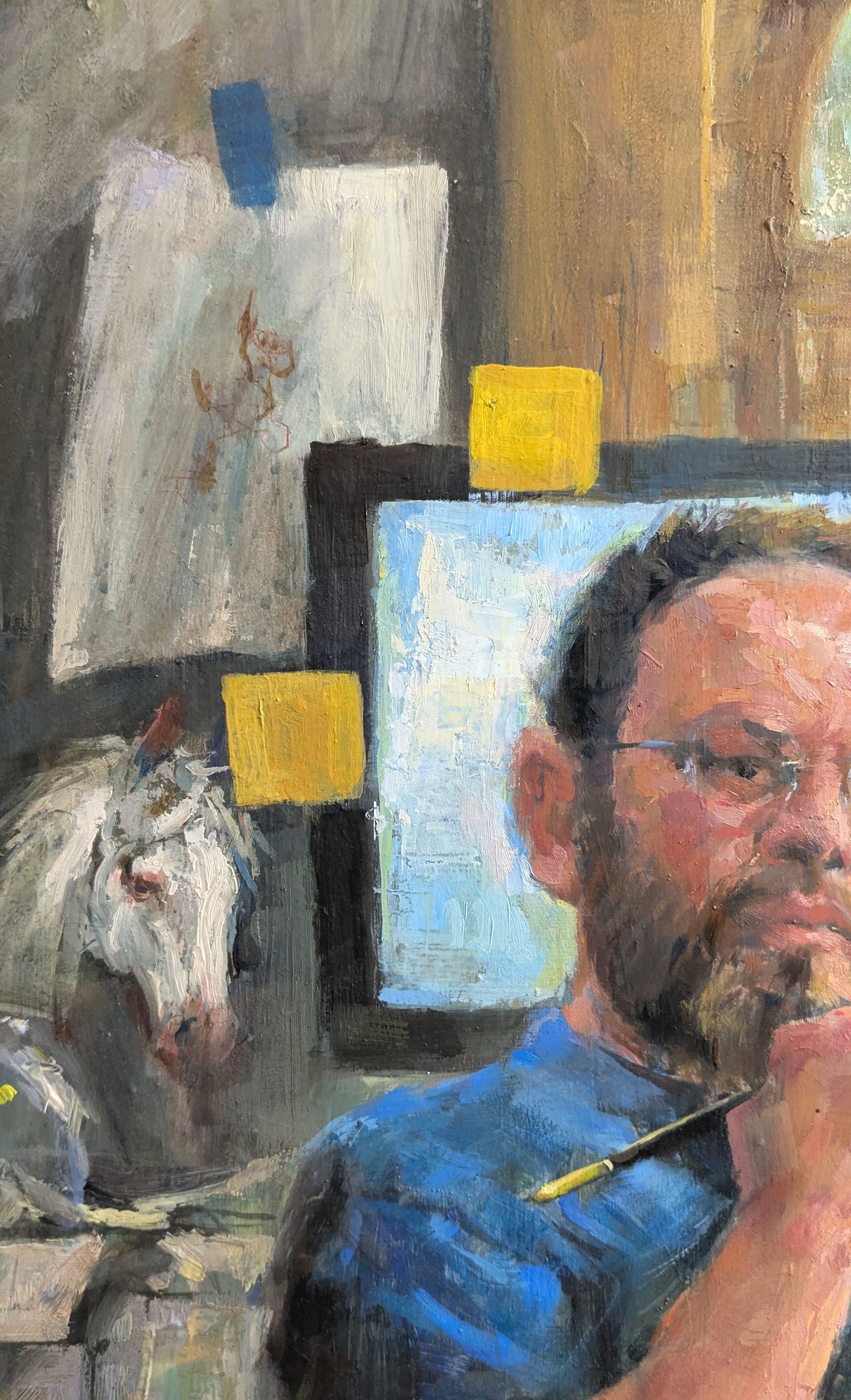 This self-portrait is a raw exploration of my journey through middle age, confronting the emotional turbulence that often accompanies such a transition. It reflects my growing sense of isolation, the bittersweet realization that my youth is behind me, and the shifting dynamics of my identity—as both an artist and now a father. The drawing of a dinosaur, created by my daughter, symbolizes my fear of becoming irrelevant, of fading into the past like something extinct. The pale horse stands as a reminder of mortality, a looming presence that feels all too close. The chaotic swirl of the background mirrors the overwhelming noise of my ADHD mind, which often feels uncontrollable. Finally, the painting on the easel serves as a poignant representation of vulnerability—an acknowledgment of the rawness and uncertainty I now face.