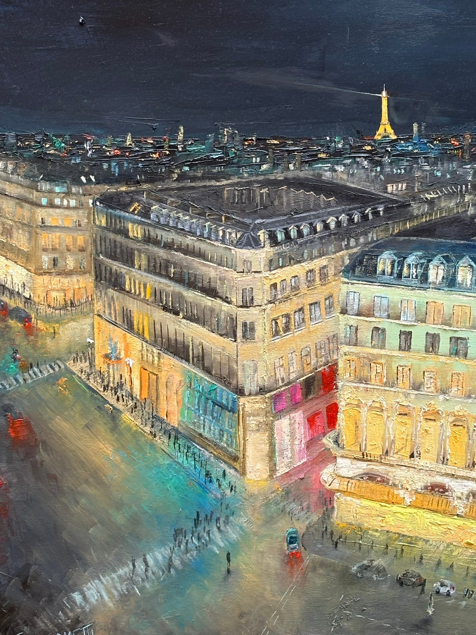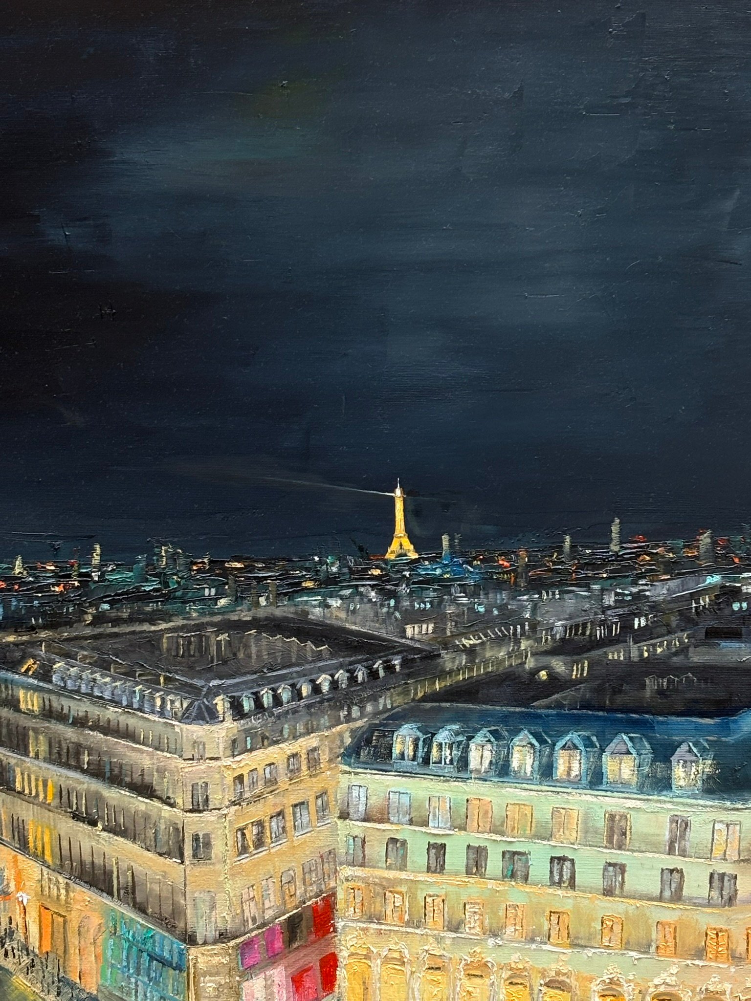 Midnight in Paris es una obra al óleo sobre lienzo inspirada en la atmósfera mágica de una noche parisina de diciembre. A través de contrastes de luz y sombra, la pintura captura la esencia vibrante y melancólica de la ciudad.