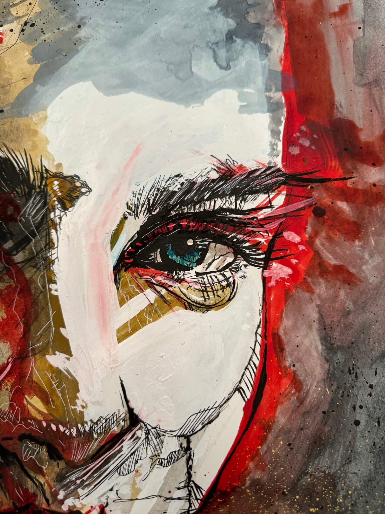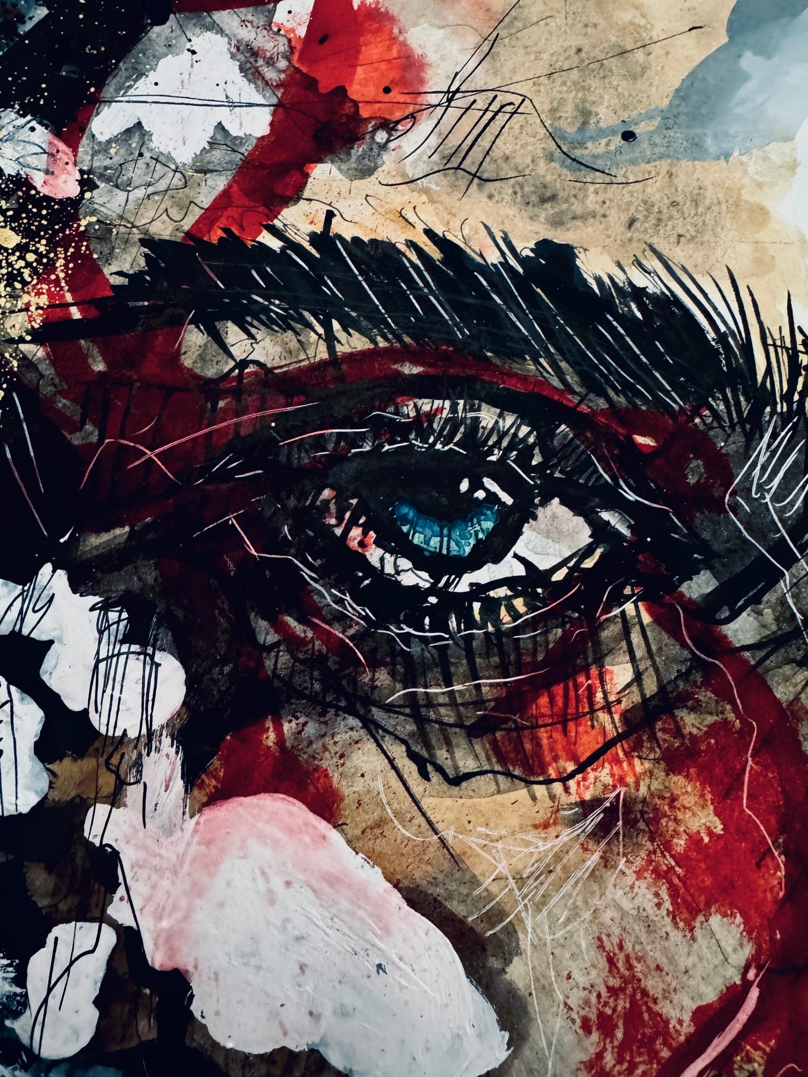 Acuarela sobre papel algodón. Miradas que surgen de la oscuridad de un alma atormentada. Ser, espíritu, cuerpo y alma que se diluyen en el devenir diario de rutina, dolor y pena.
