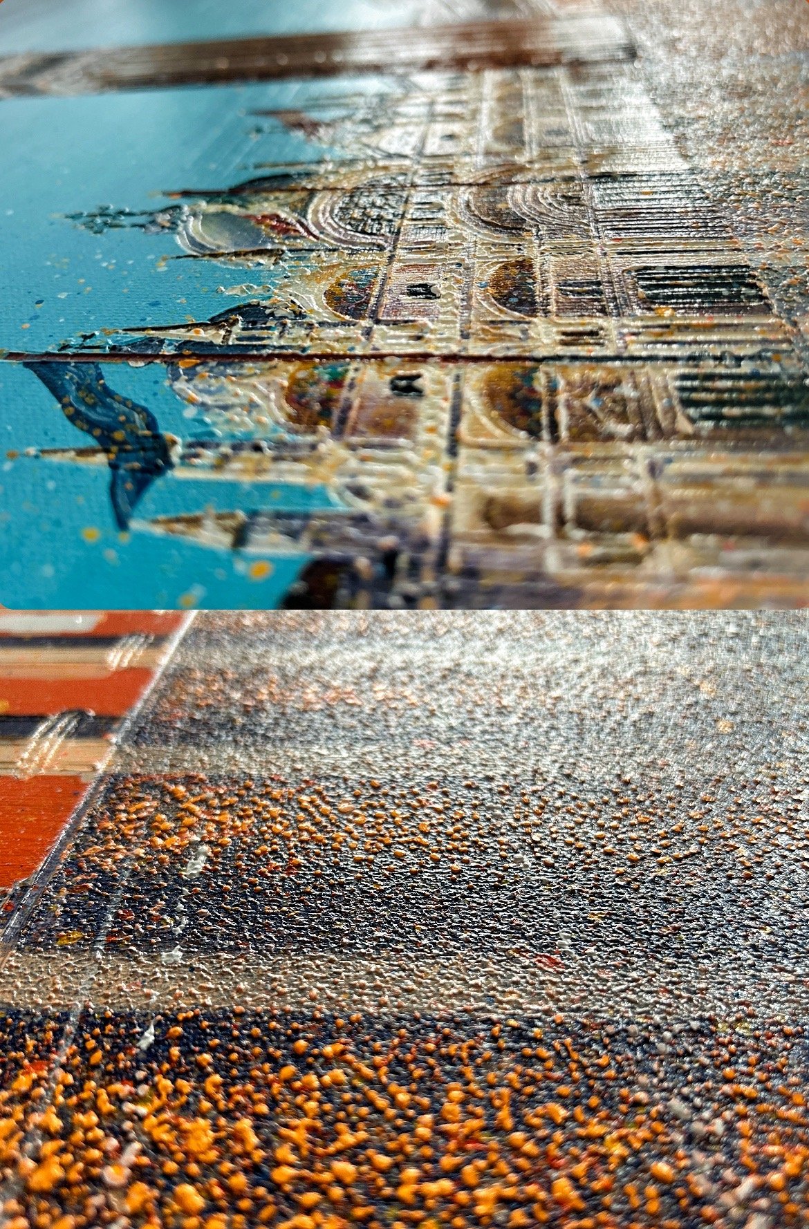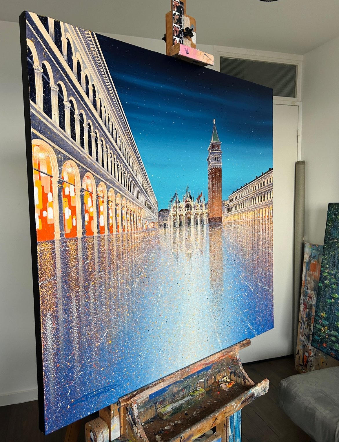 J’ai réalisé une peinture en relief de la place Saint-Marc sous l’empreinte silencieuse de l’Acqua Alta, où l’eau transforme l’architecture vénitienne en un miroir presque irréel. Le Campanile se dresse majestueux, tandis que les façades baignées de lumière s’étirent dans les flots. Je joue avec la texture et la lumière; les touches dorées vibrent sur les arcades, contrastant avec le bleu profond du ciel nocturne. La perspective envoûtante suspend le temps, laissant Venise flotter entre ciel et mer. Tout le tableau est en relief; on peut passer la main dessus et sentir les moulures des murs, la texture du sol, les ondulations de l’eau. Chaque détail renforce l’immersion, rendant la scène presque palpable. À travers cette œuvre, je ne peins pas seulement un paysage, mais une émotion ; celle d’une Venise éternelle, fragile et éclatante, sublimée par l’eau et la lumière.