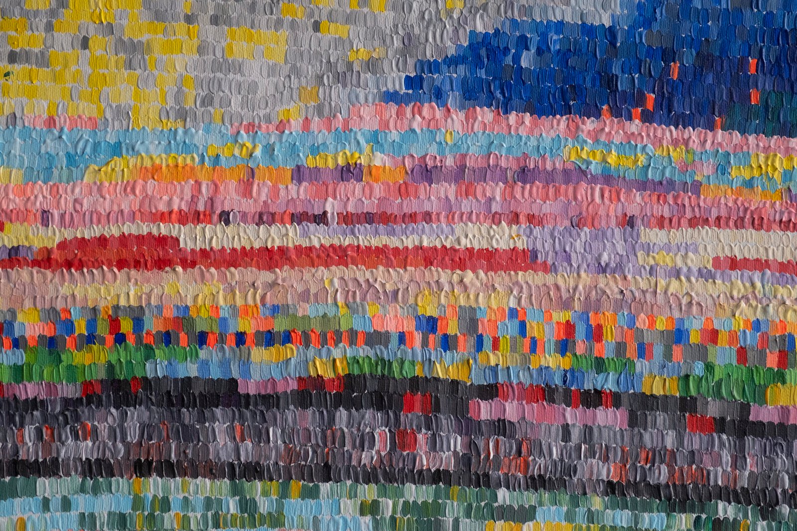 Every stroke in this painting is as unique as each day of the year. I began this piece in 2022 and completed it one year later, in 2023. It is my personal collection of moments: the long autumn evenings, fiery winter sunsets, bursts of anger and joy, laughter-filled meetings with friends, the freshness of spring, the quiet melancholy of summer nights, the sparkle of sunshine, and rooftops bathed in golden sunsets. I wanted to capture every fleeting shade that caught my eye—sky gradients, the softness of petals, the glow of city lights at dusk, and the transition of day into night. This painting became a vessel for my emotions: contentment, joy, anger, melancholy, and excitement poured onto the canvas. This is how this painting was born—a fusion of perceptions, emotions, experiences, and cherished moments, woven together in vibrant color and form.