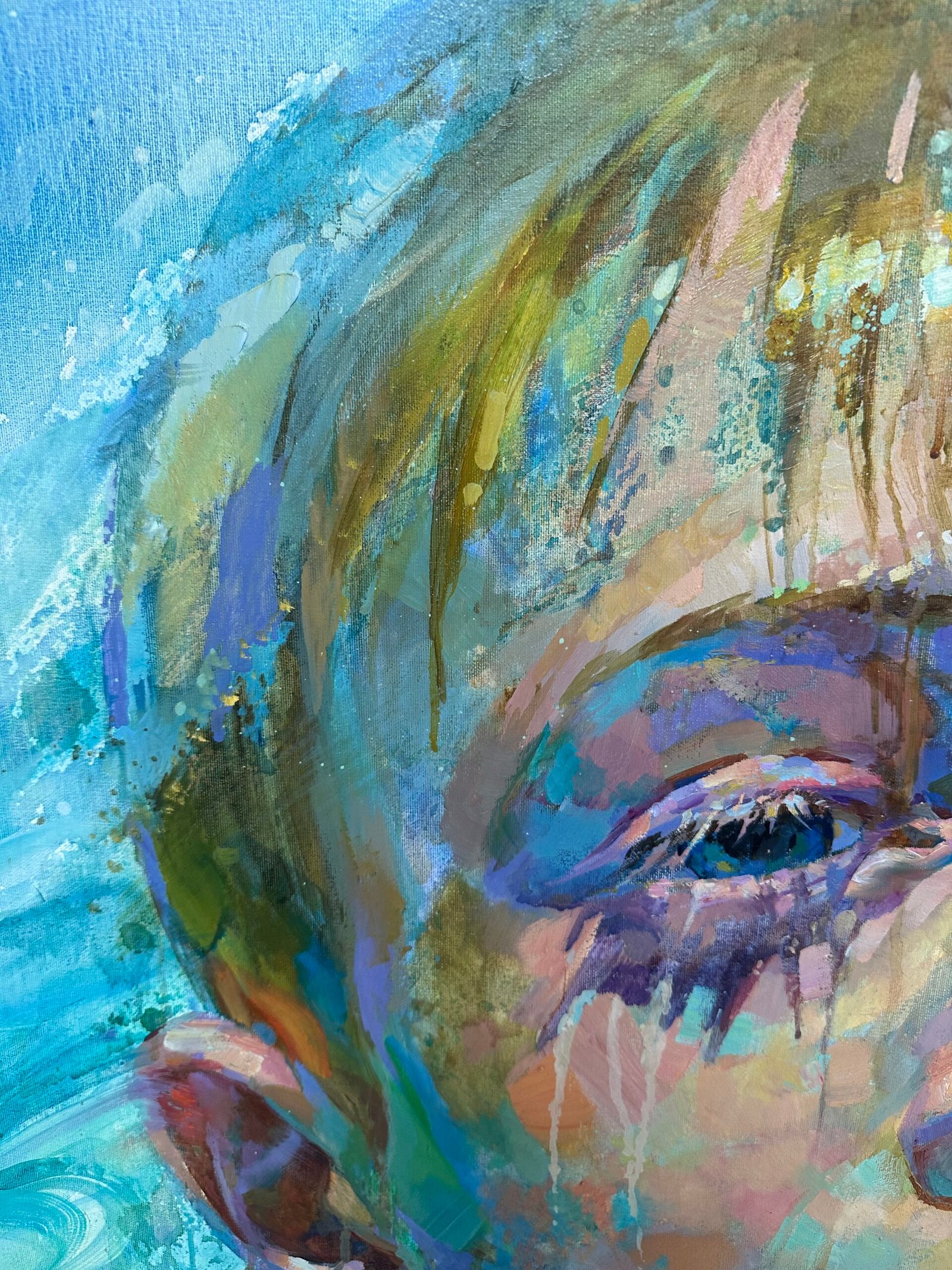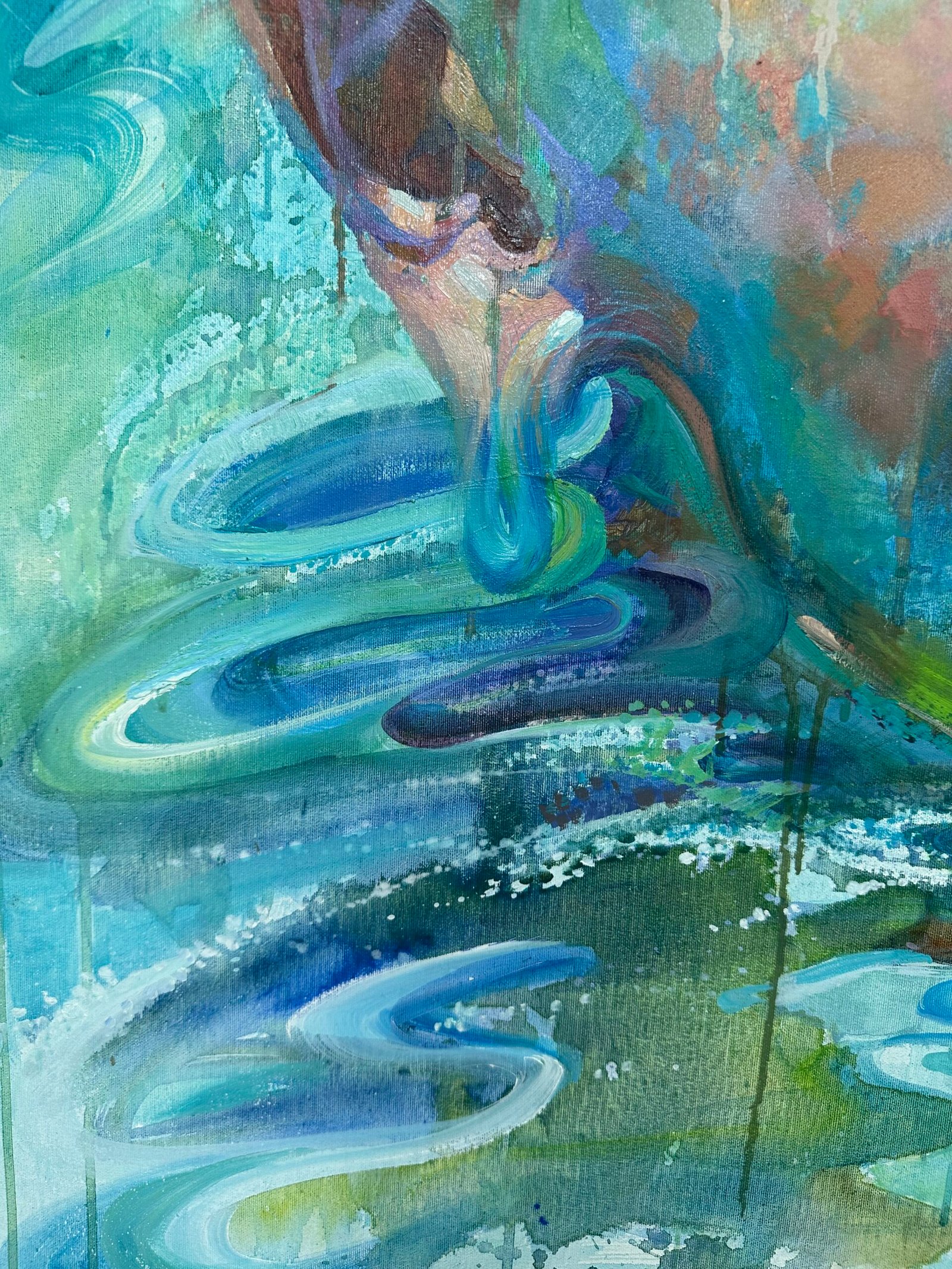 En cuadro “Nadador” pertrnece a la serie “El mar” El mar tanto atrae como inquieta. Rodea, envuelve y convierte a la persona en parte de su realidad fluida. En su abrazo, la alegría brillante contrasta con la ansiedad de la fugacidad. Utilizo pinturas fluorescentes y veladuras transparentes para realzar el juego de luces y sombras, de alegría y miedo, dejando la huella de la fragilidad del momento. De este modo, capturo la fragilidad del momento, uno que puede desvanecerse en un instante.